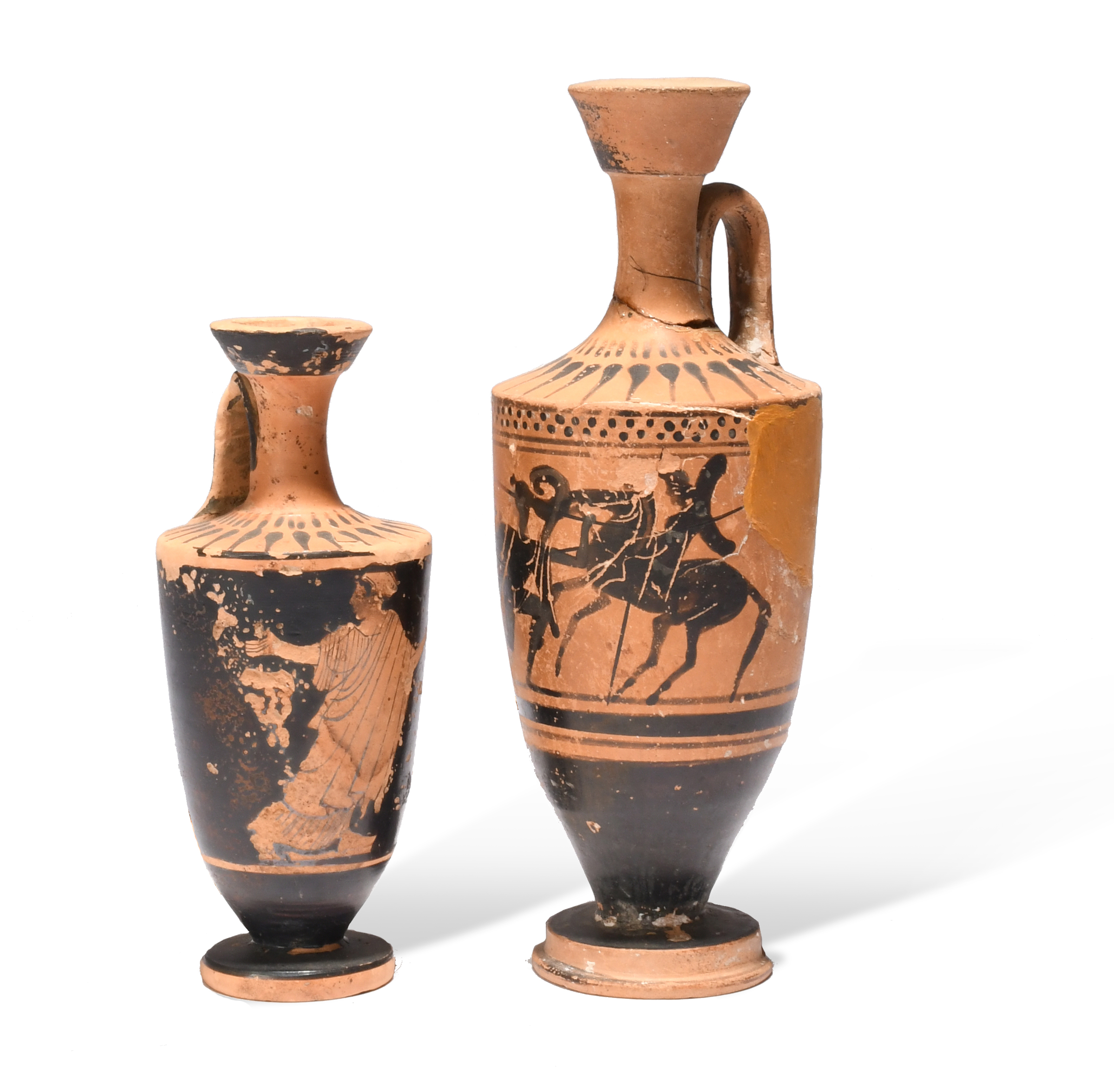 and a Greek black figure lekythos, circa 5th - 4th century BC, depicting two mounted horsemen attacking a hoplite, 16.5cm high. (2)