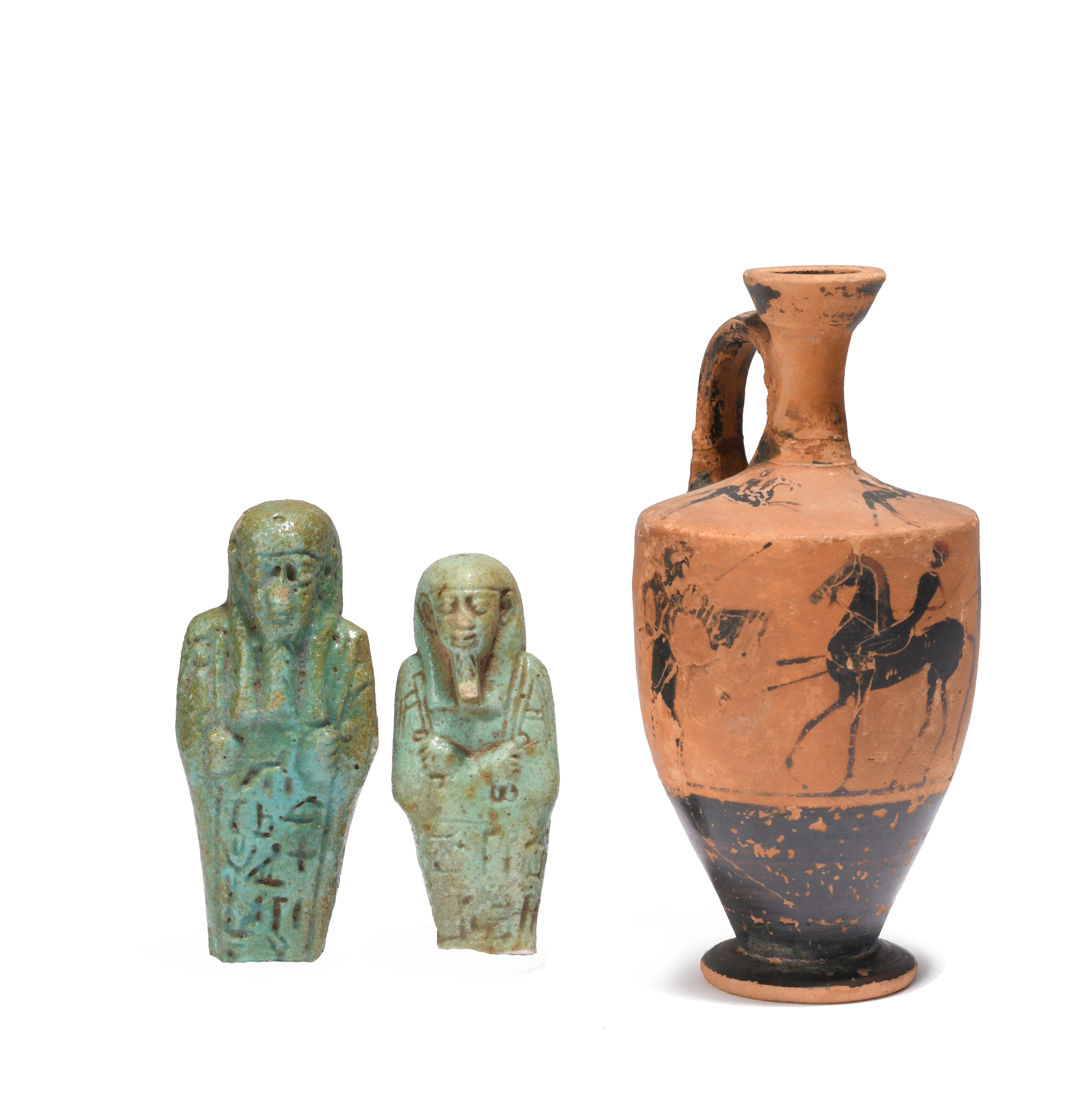and two Egyptian shabti fragments, Late Period, circa 664 - 332 BC, 7.2cm and 8.2cm high. (3)