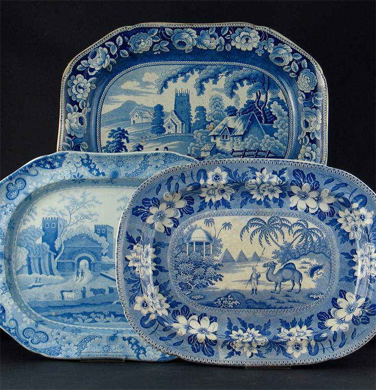 Three blue and white meat plates, printed with buildings, figures and animals including a camel, one marked for Spode, all c.1820-30, 43cm. Max. (3)
