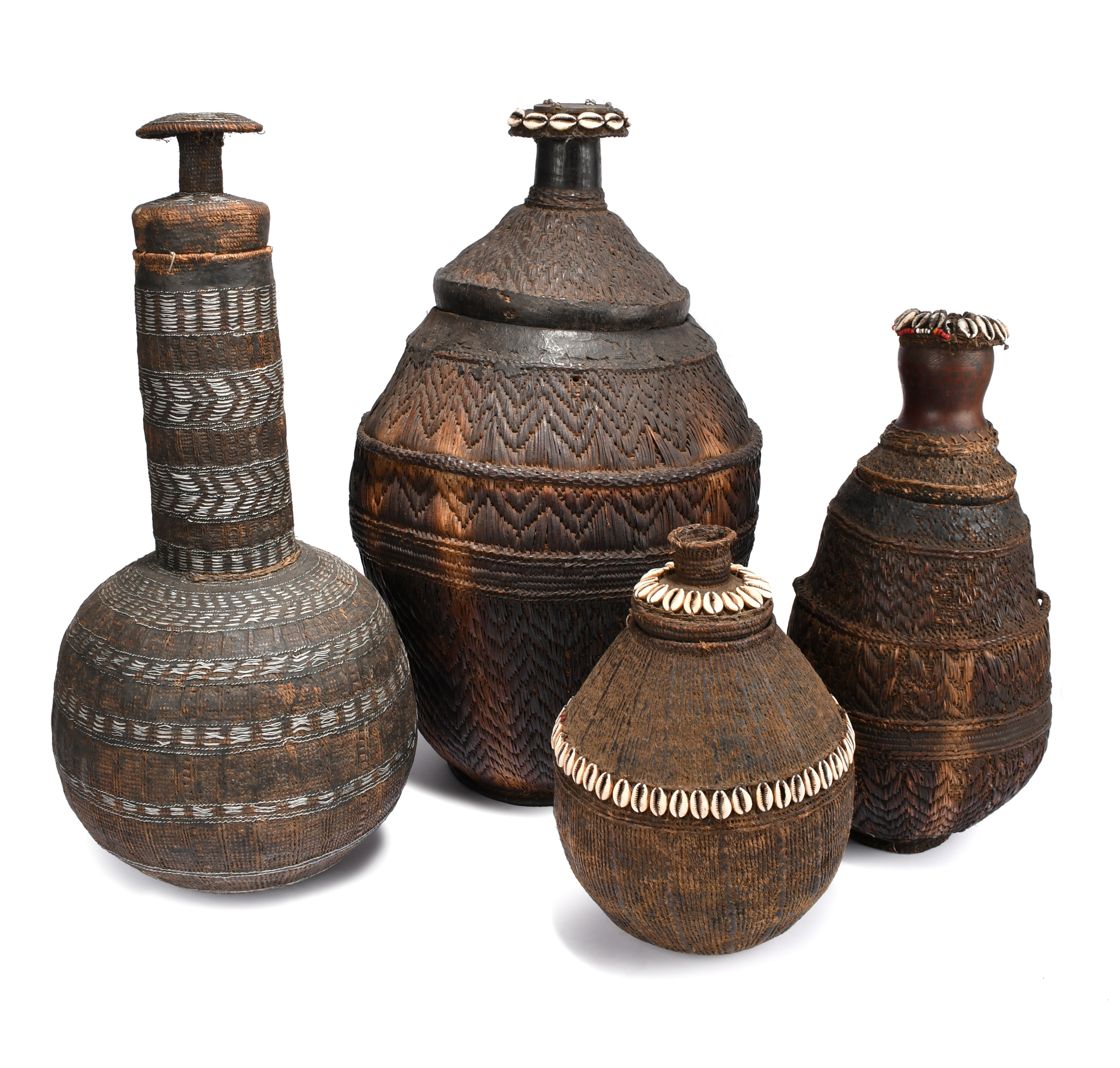 and three Ethiopian vessels with covers, with applied cowrie shells, one cover part gourd with incised decoration, 28.5cm, 41cm and 56cm high. (6)