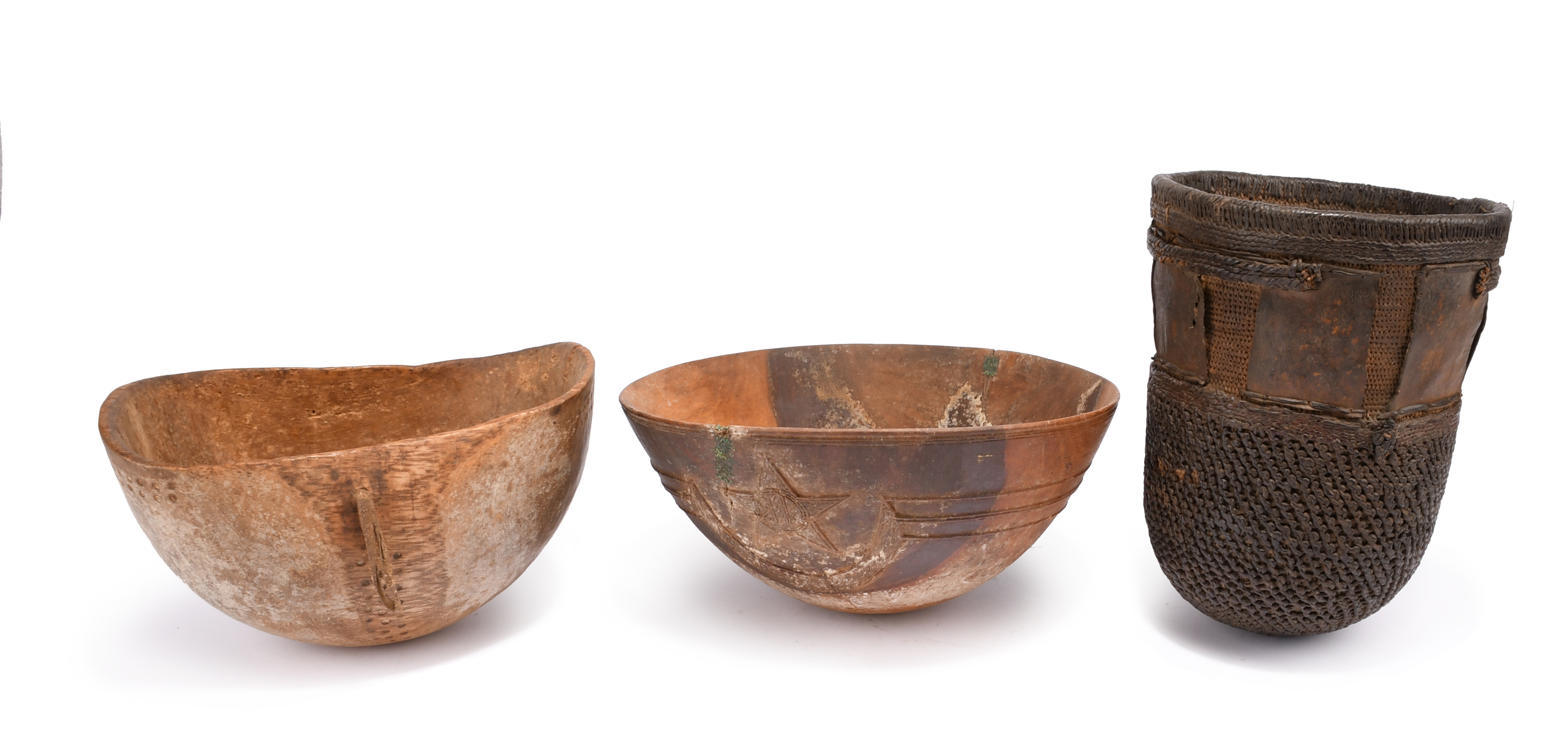 a Turkana bowl, with punched dot decoration and a leather handle, 22.5cm long and a Kuba? basketry container with applied leather panels, previously with a strap handle, 22cm high. (3)
