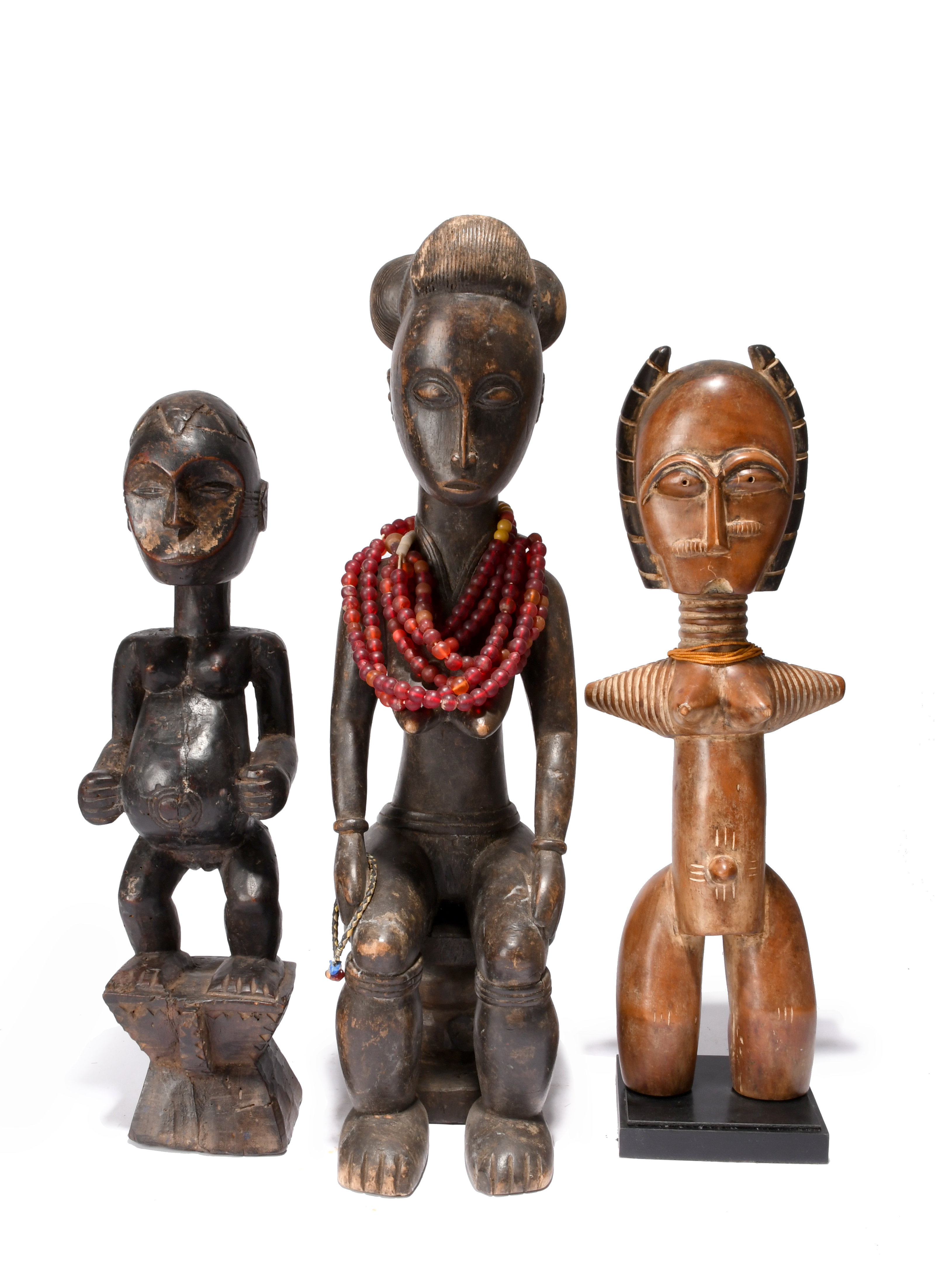 a Fante female figure, 45cm, on a base and an Eket female figure, 45cm high. (3)