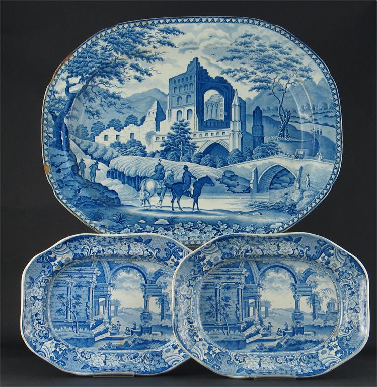 A large blue and white meat plate, printed with a couple on horseback before a large ruined building, unmarked, 52.5cm. and a pair of small blue and white meat plates printed with figures beneath ruined arches, 32.5cm. c.1820-30. Minor damage. (3)