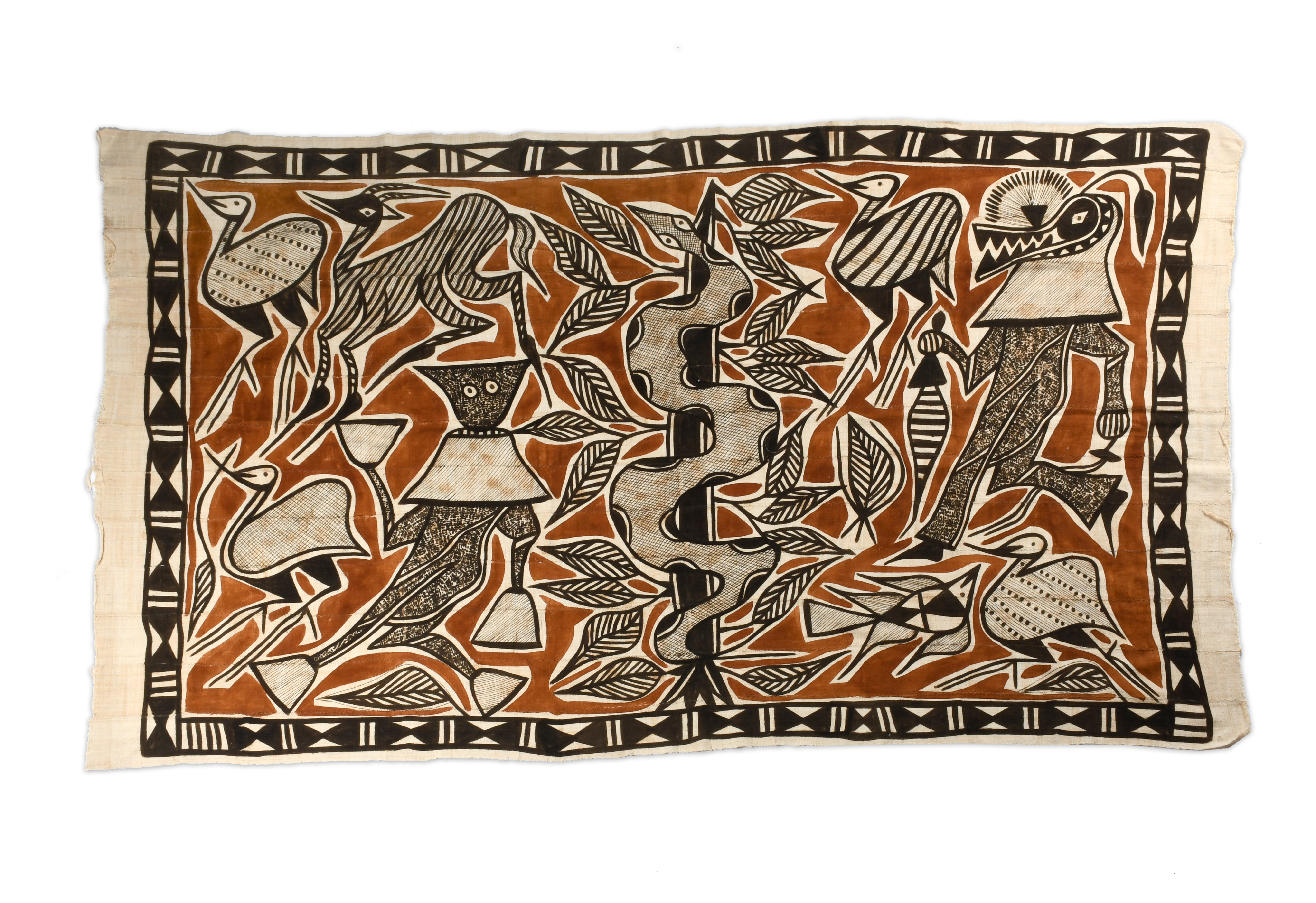 of thirteen strips, painted with figures, animals, birds, a fish and a snake in a tree,
