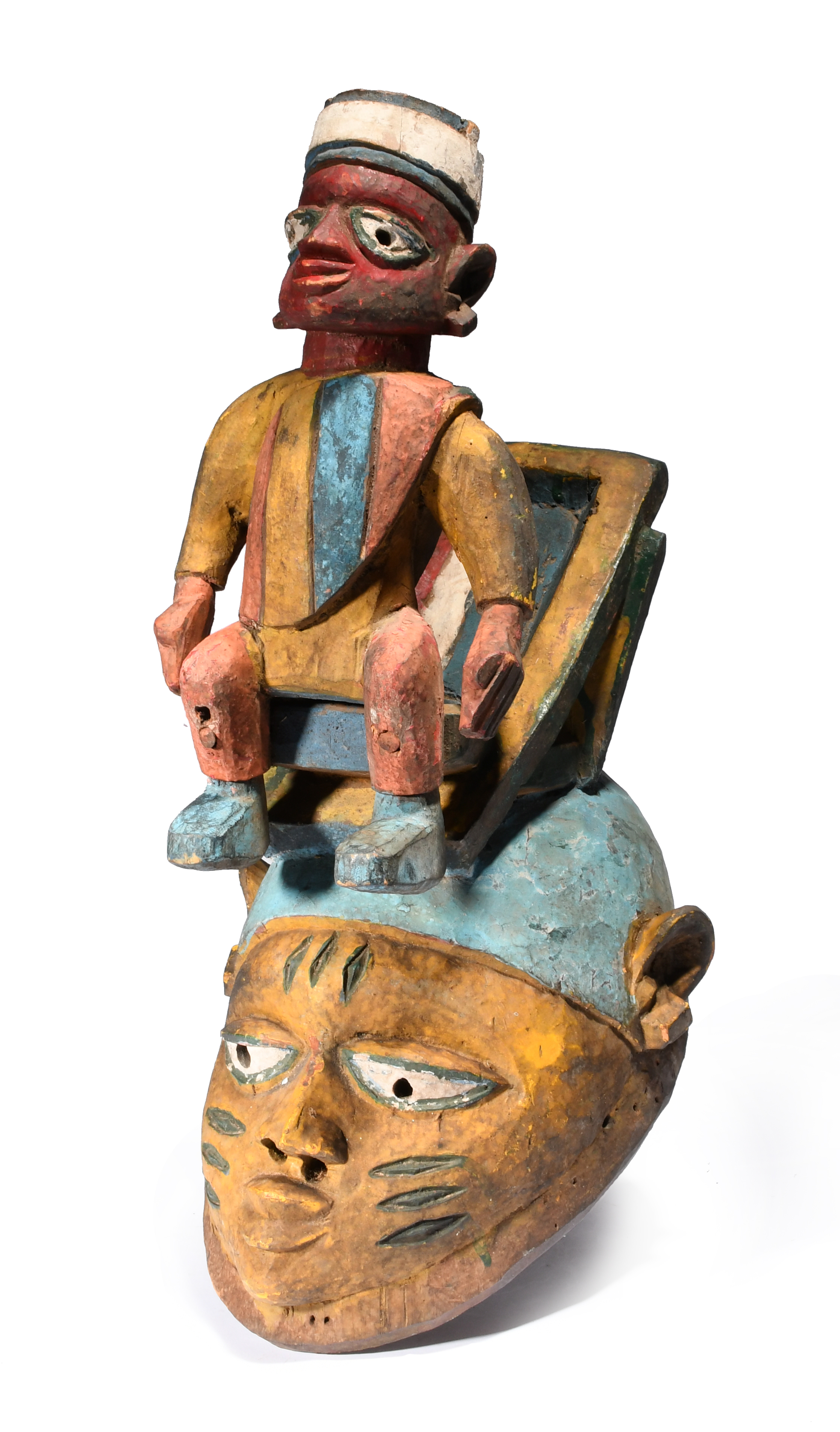 surmounted with a male figure, wearing a cap and sitting on a folding chair, with bright pigment decoration,