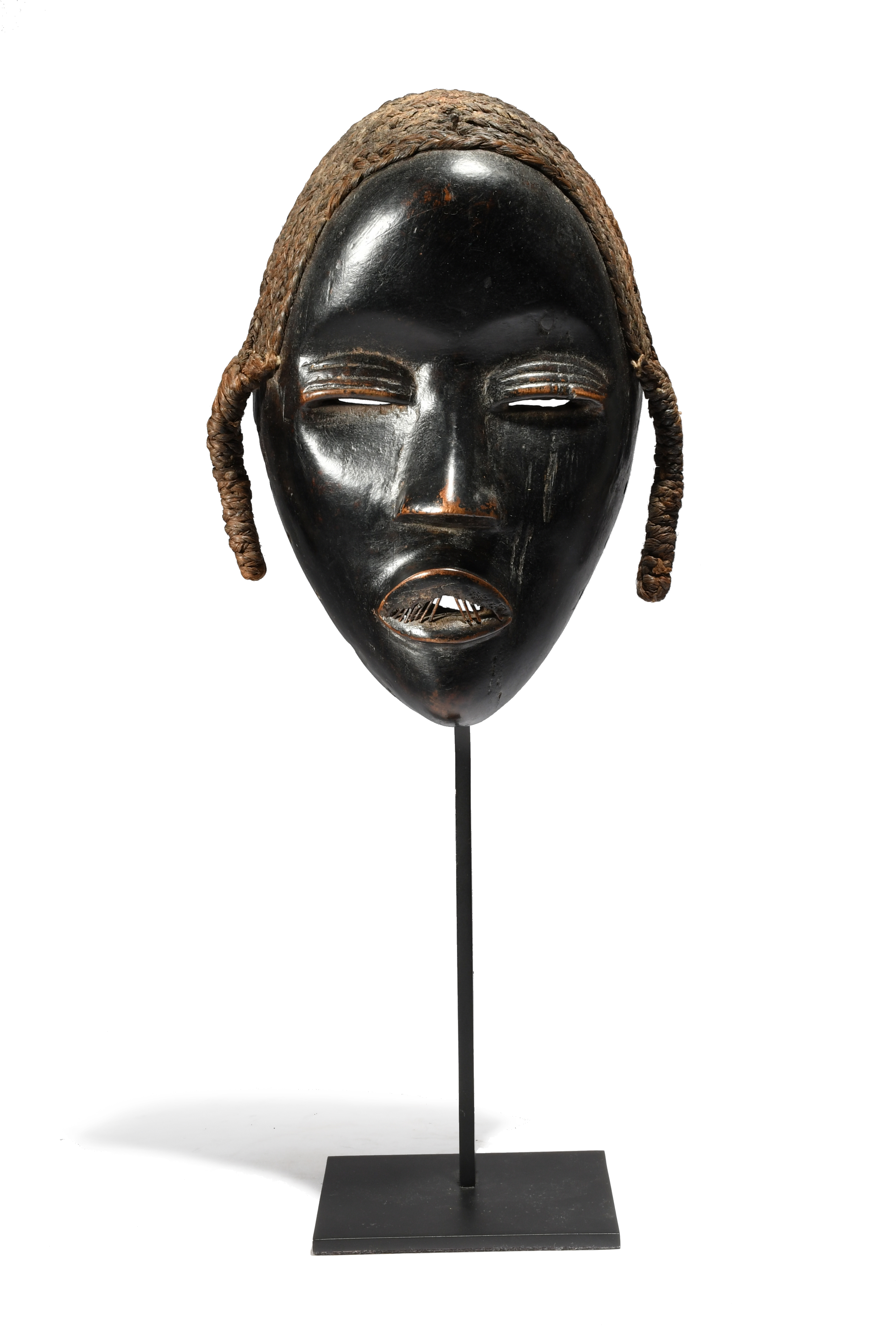 with an applied plaited fibre coiffure and an inset nail, the set back eye slits with linear carved lids and the open mouth with resin applied fibre teeth,