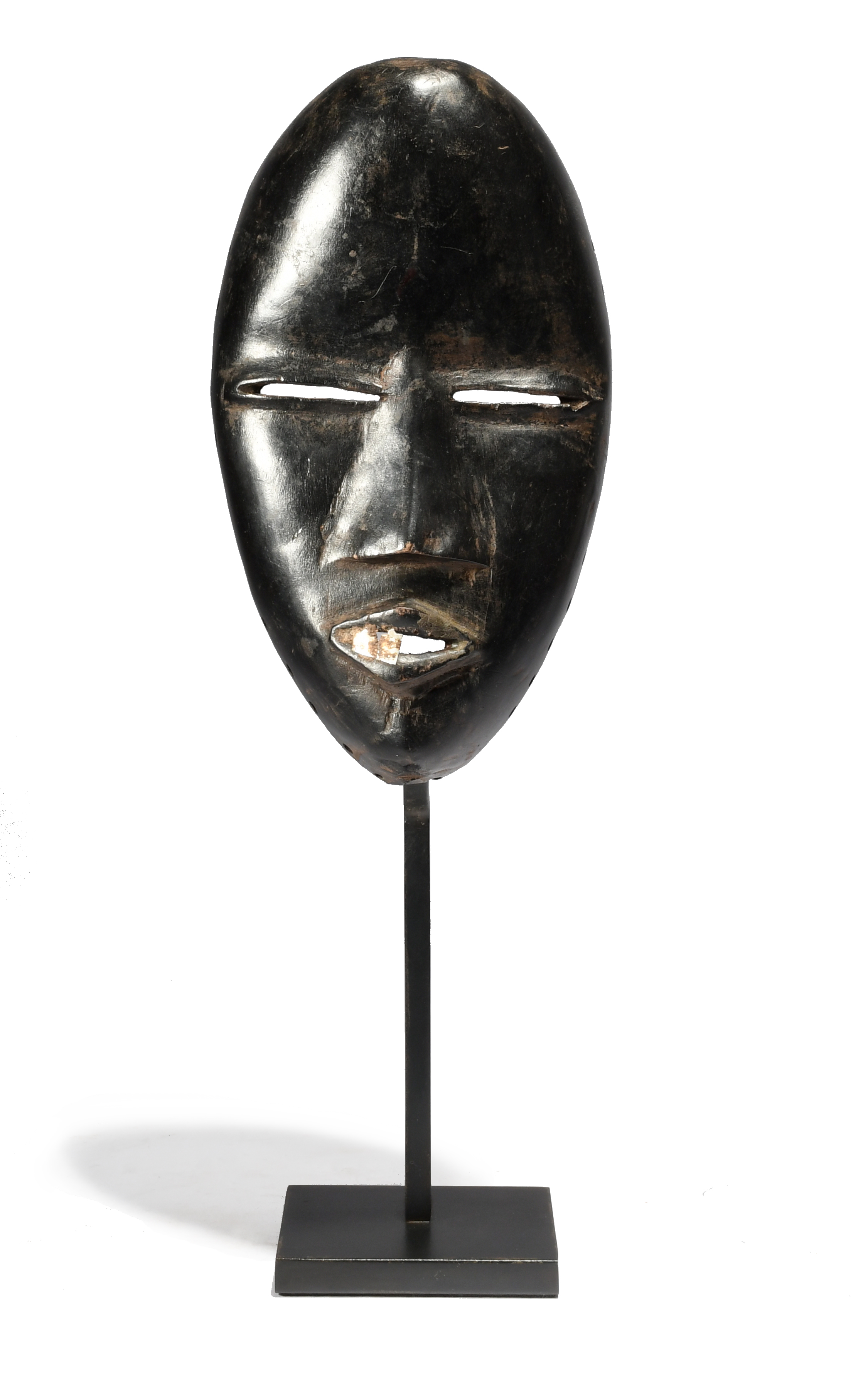 with slit eyes and a flat nose, the open mouth with two remaining aluminium teeth,