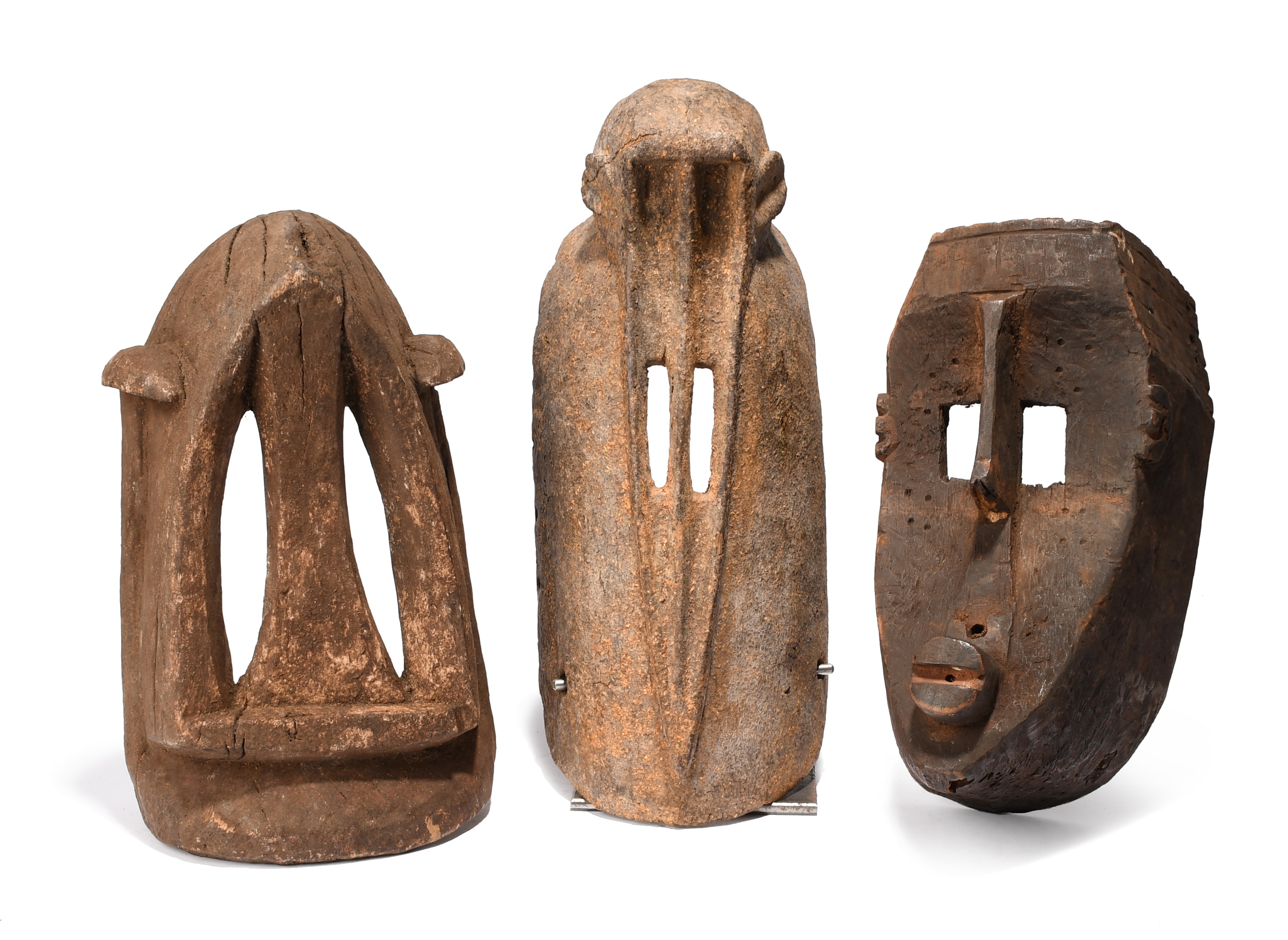 and two Dogon masks, 31cm and 37cm high, on a stand. (4)