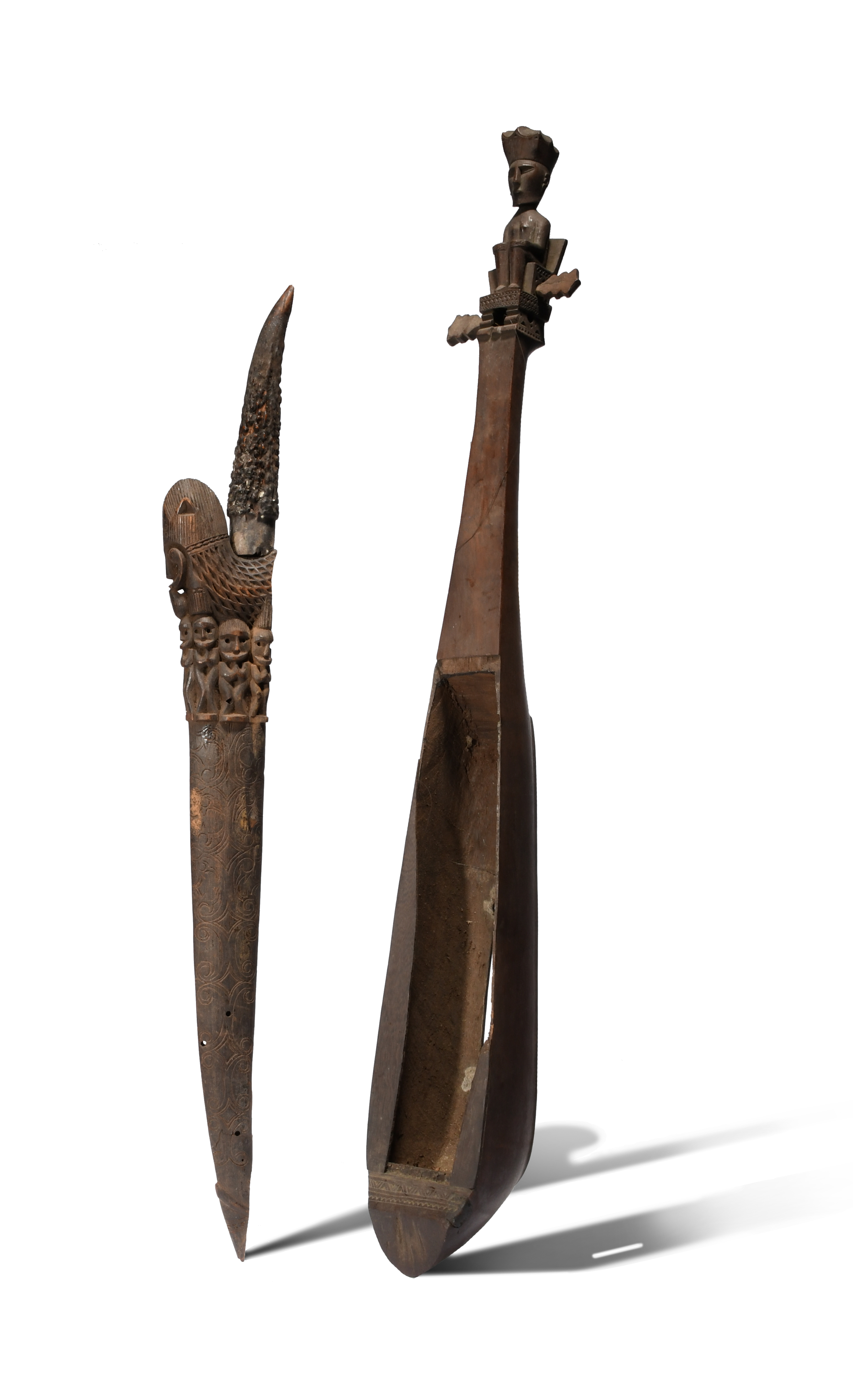 and a Batak knife with an antler handle and a carved wood scabbard, 55cm long. (3)