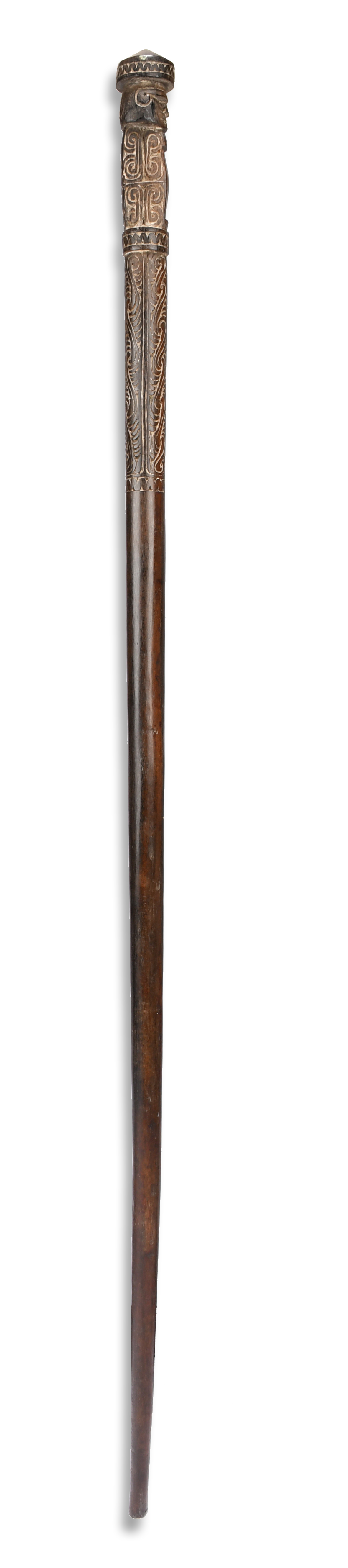 the finial with a carved seated figure wearing a pointed cap and with scroll decoration,
