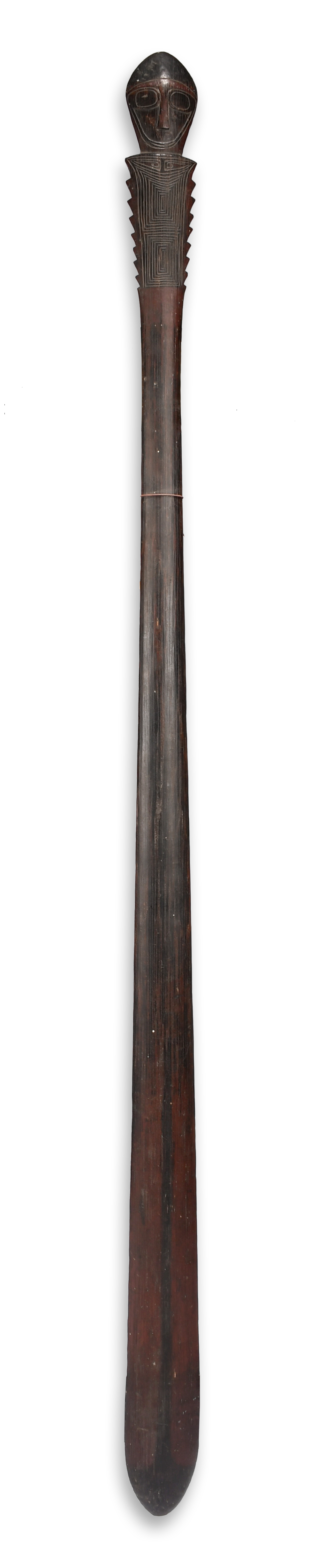 of spatulate form with a carved Janus head finial above serrated edges and concentric incised panels, with pigment staining, with the remains of an old lot label,