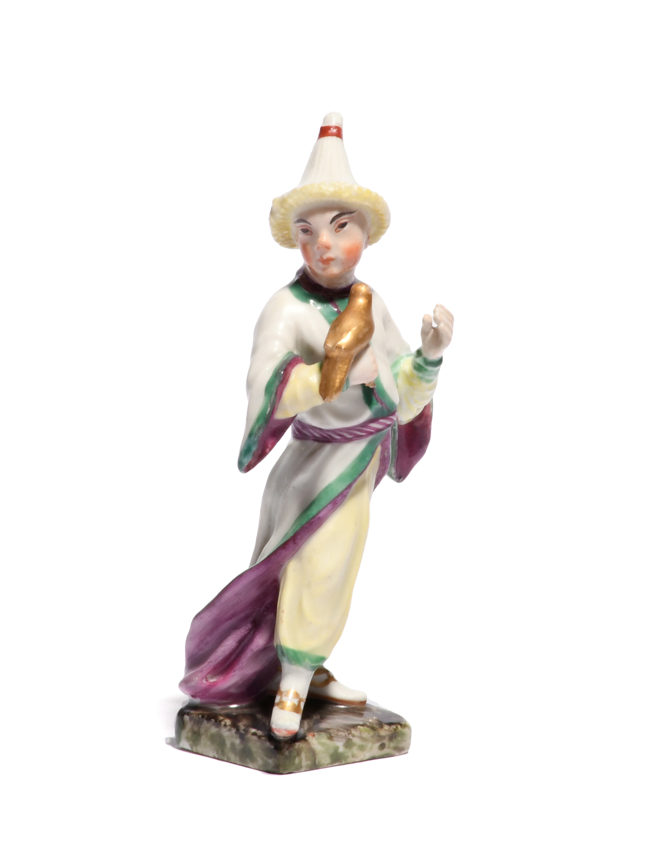 A small Ludwigsburg chinoiserie figure of a boy c.1770, standing and holding a gold bird perched on one hand, wearing a conical hat above an Oriental robe, raised on a square base, blue mark to the back of the base, 10.8cm.