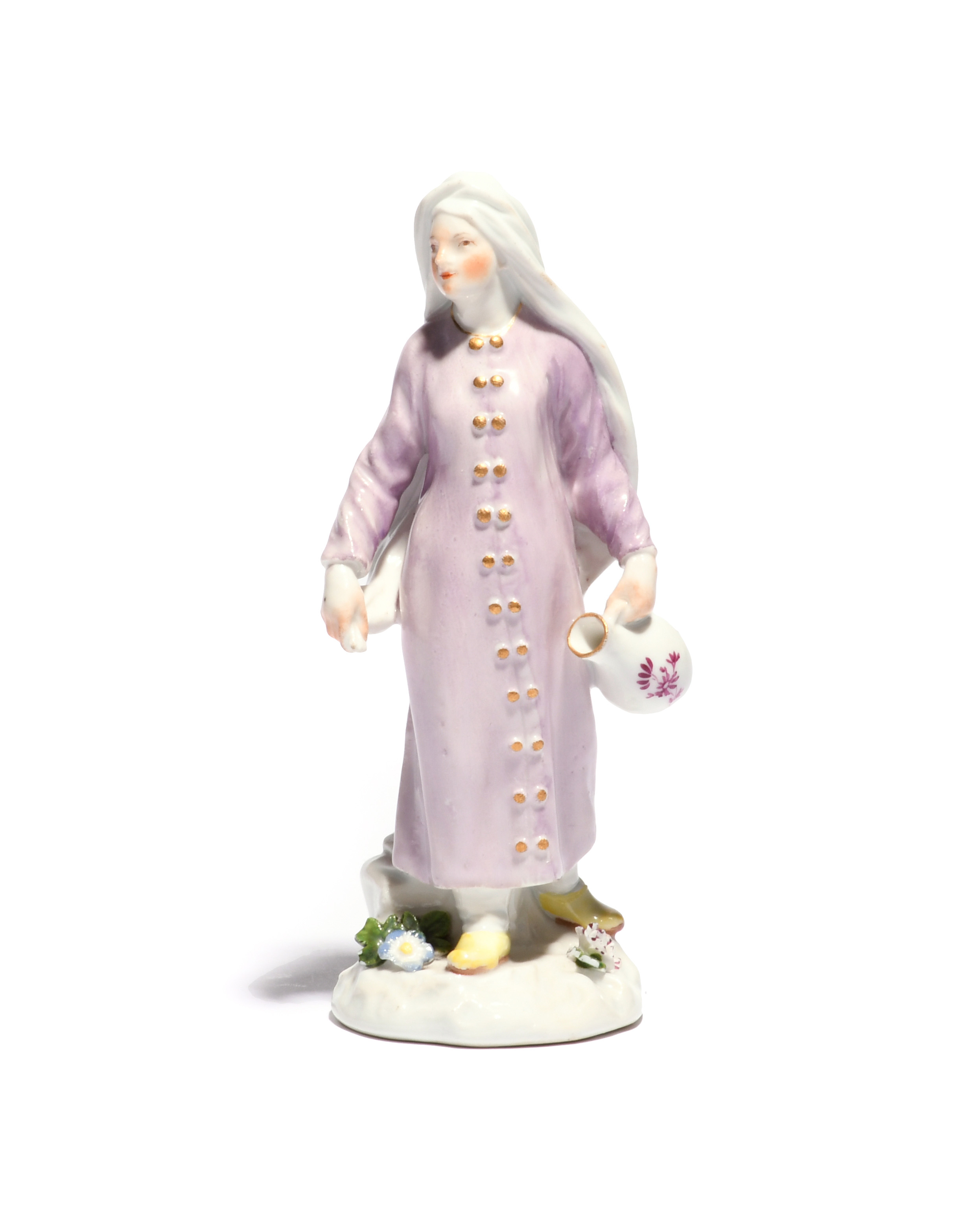 A Meissen figure of a Turkish woman mid 18th century, wearing a long shift tunic in pale lilac with gold buttons, carrying a jug in her left hand, raised on a low base applied with flowers and leaves, blue crossed swords mark, 14cm.