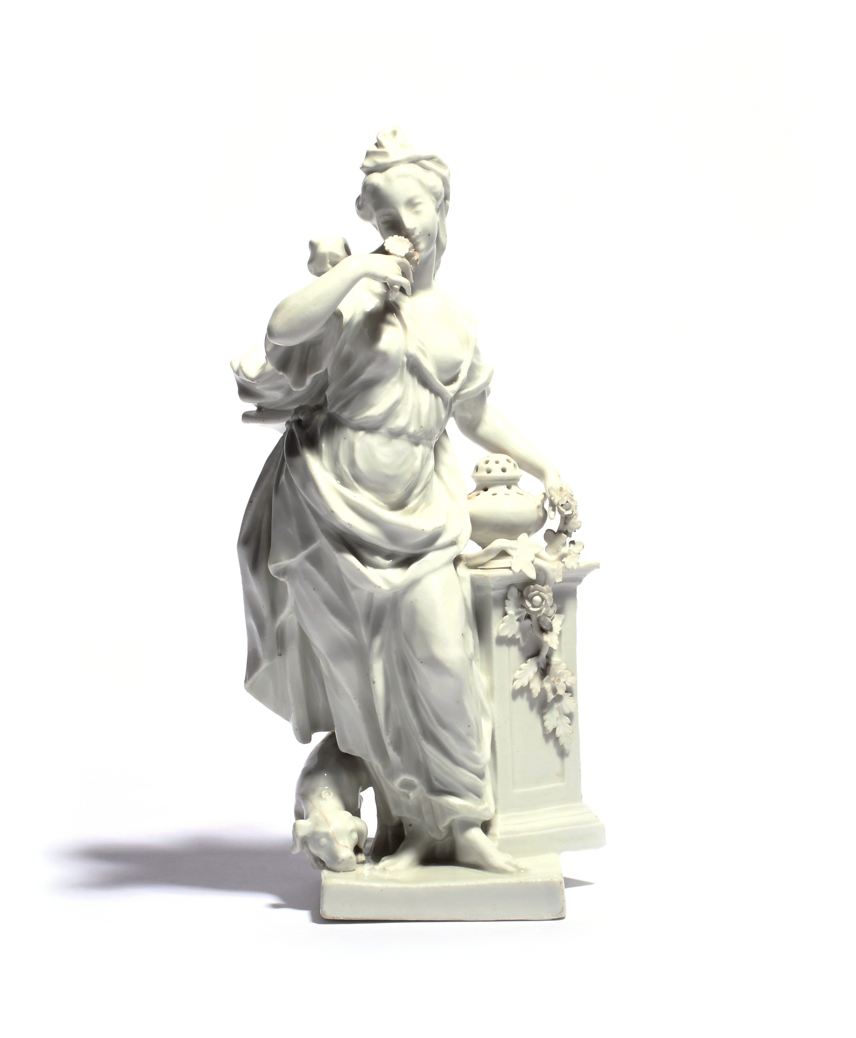 A Meissen white-glazed figure emblematic of Smell mid 18th century, modelled by J J Eberlein as a Classical maiden holding a flower to her nose and standing beside a pot pourri vase on a square plinth, a dog sniffing the ground by her feet, blue crossed swords marks, some damages, 28cm.