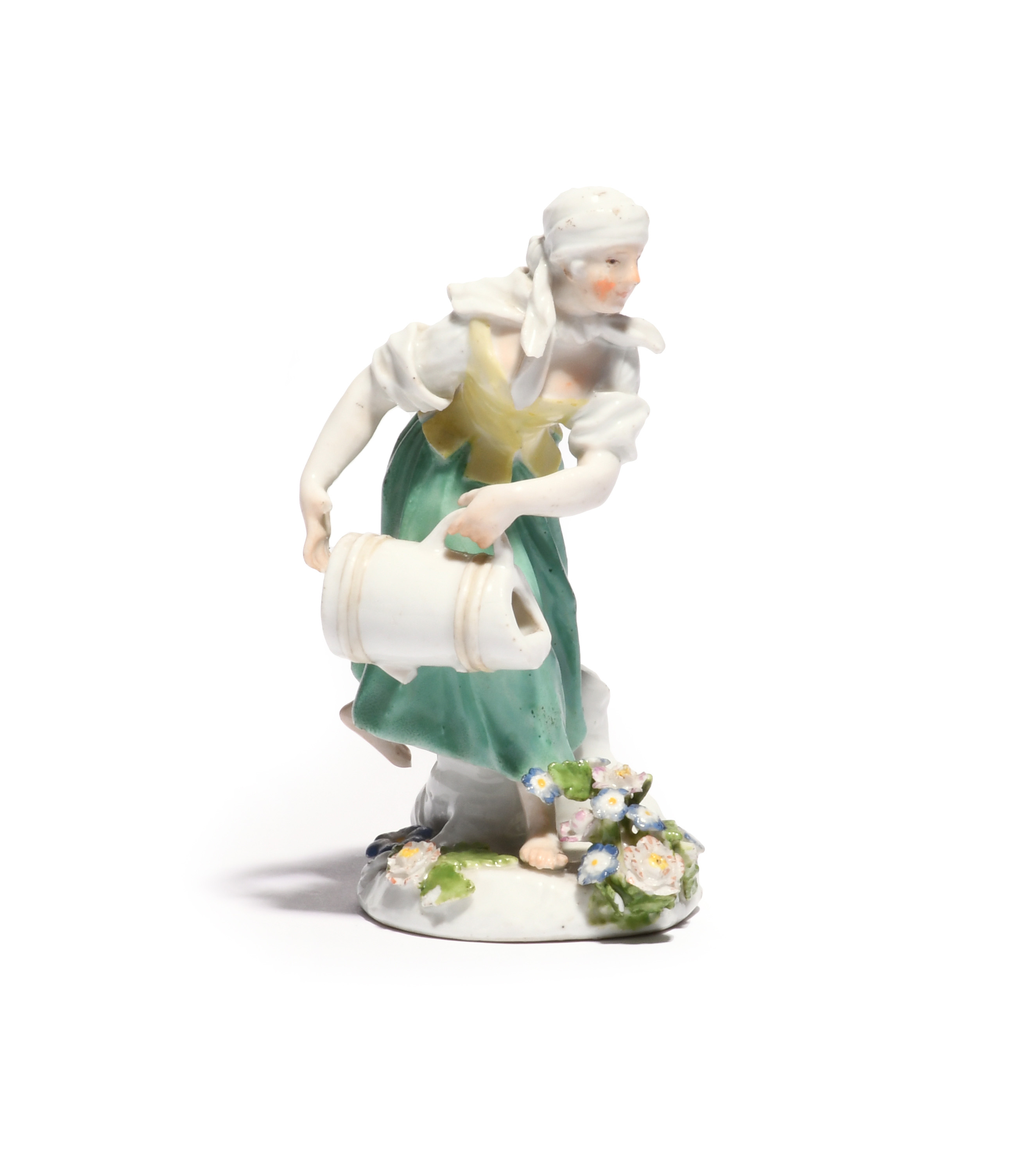 A small Meissen figure of a girl mid 18th century, wearing a white headscarf and bodice over a green skirt, upending a large jug over flowers growing at her feet, blue crossed swords mark, minor losses, 11.5cm.
