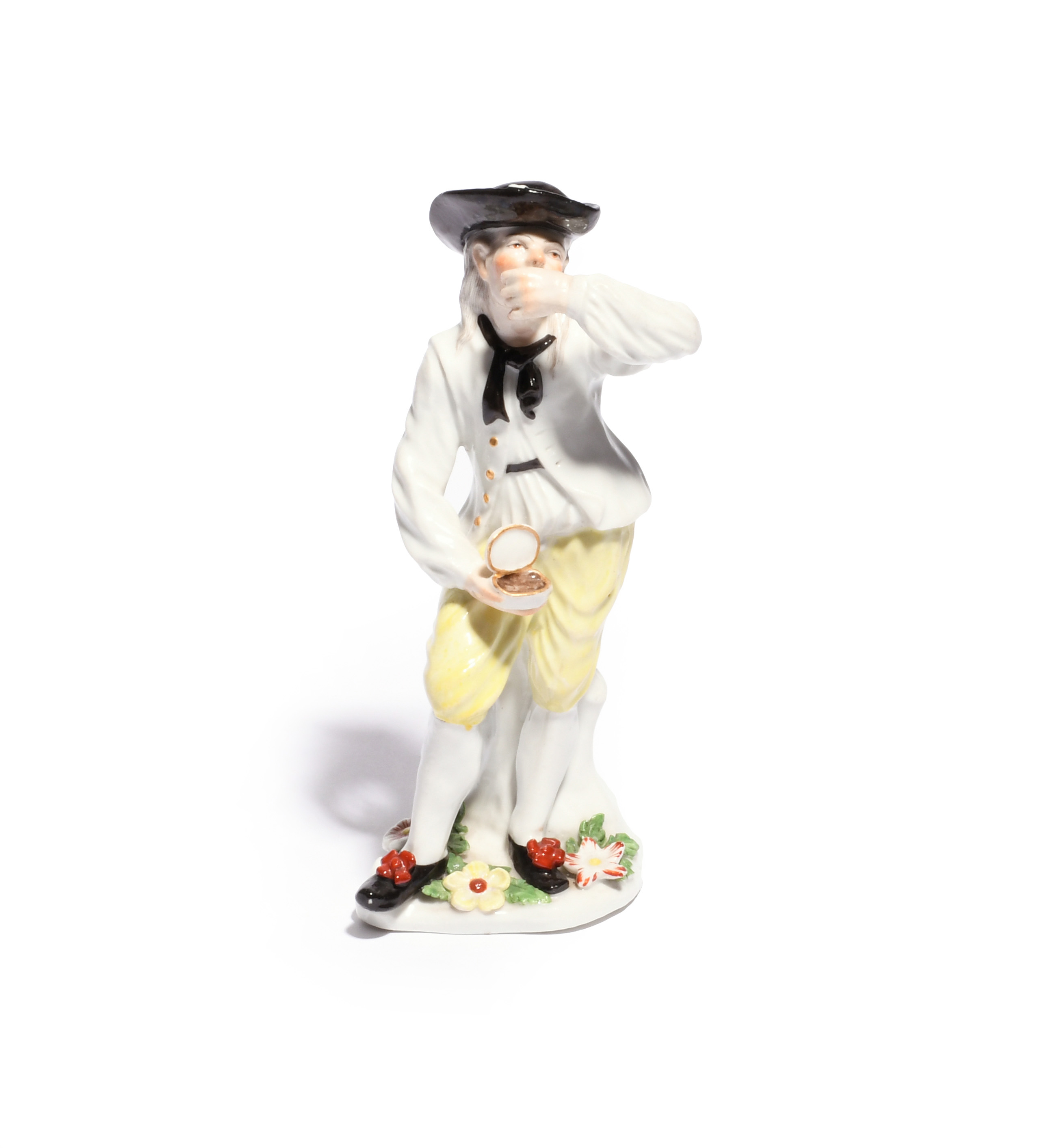 A Ludwigsburg figure of a snuff taker c.1765-70, standing and raising a pinch to his nose with his left hand, from a small snuff box held in his right, the low pad base applied with flowers, blue crowned CT monogram, 18.5cm.