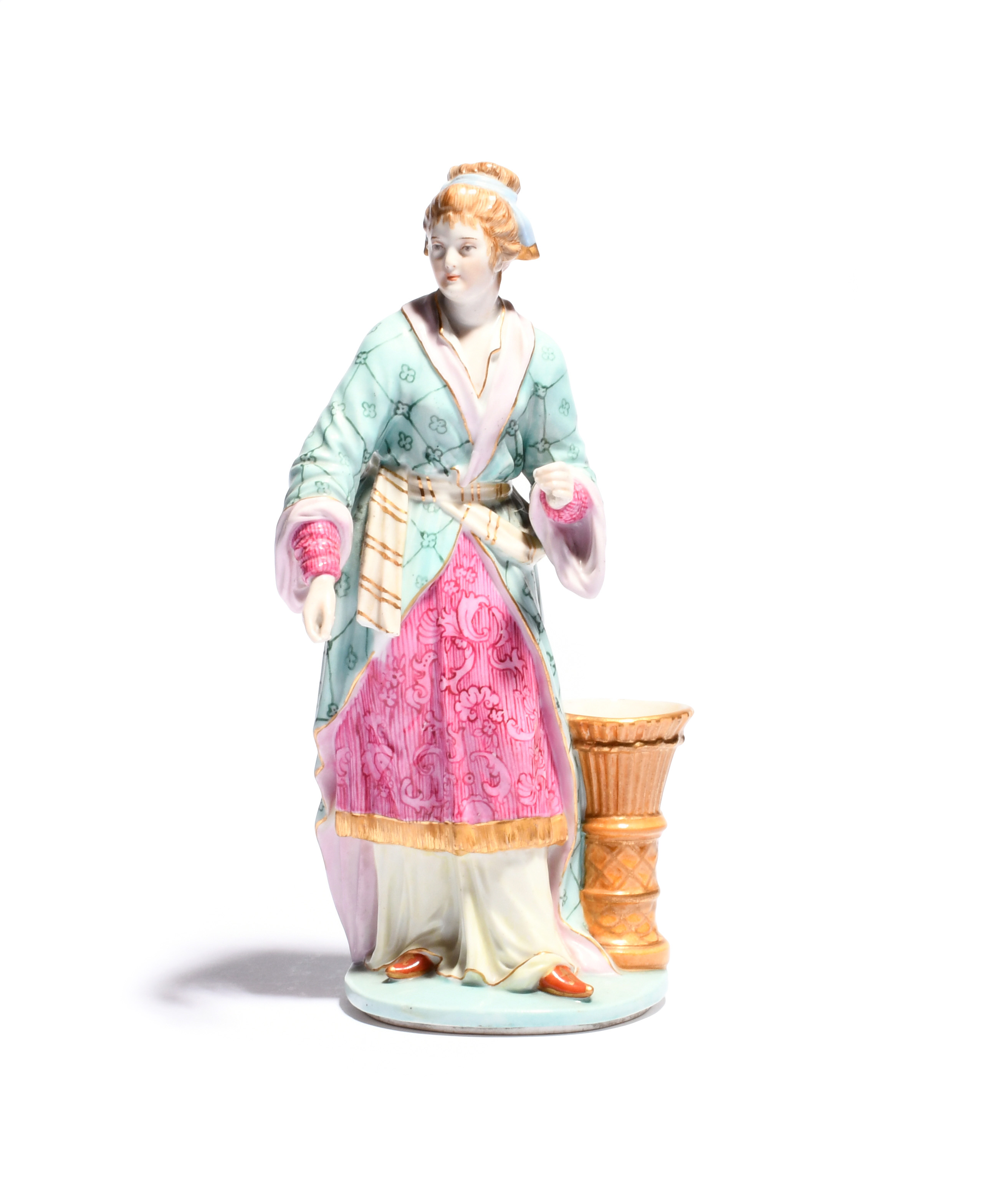 A Berlin vase figure 19th/early 20th century, modelled as a young woman in Eastern dress standing beside a tall flared vase, raised on a low blue base, blue sceptre mark, 24cm.