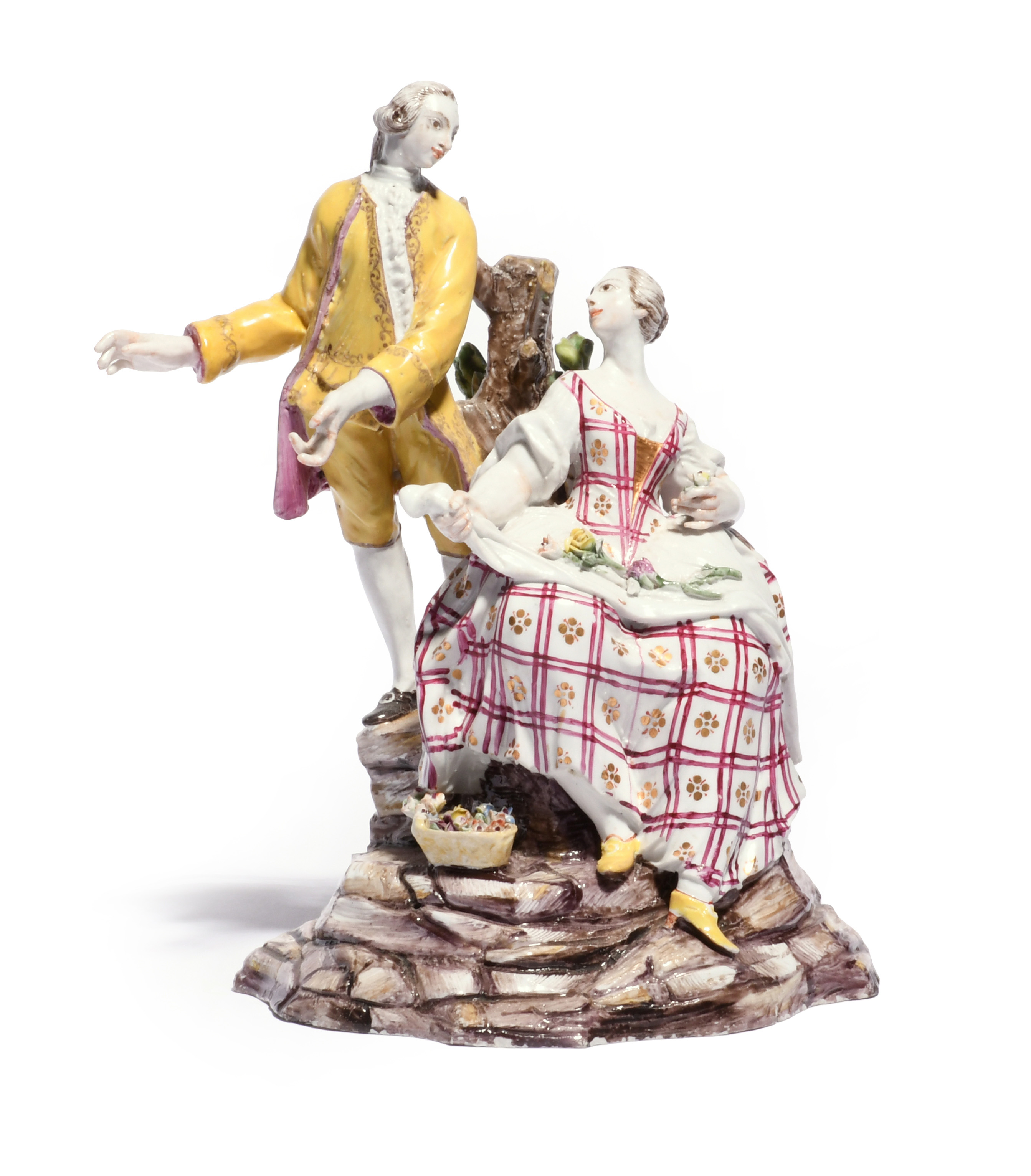 A Doccia figure group c.1780, possibly emblematic of Spring, modelled as a gallant and his companion, he standing before a tree stump, she seated on the rocky base with flowers strewn in her apron, a further basket of blooms by her side, a little restoration, 19.5cm.