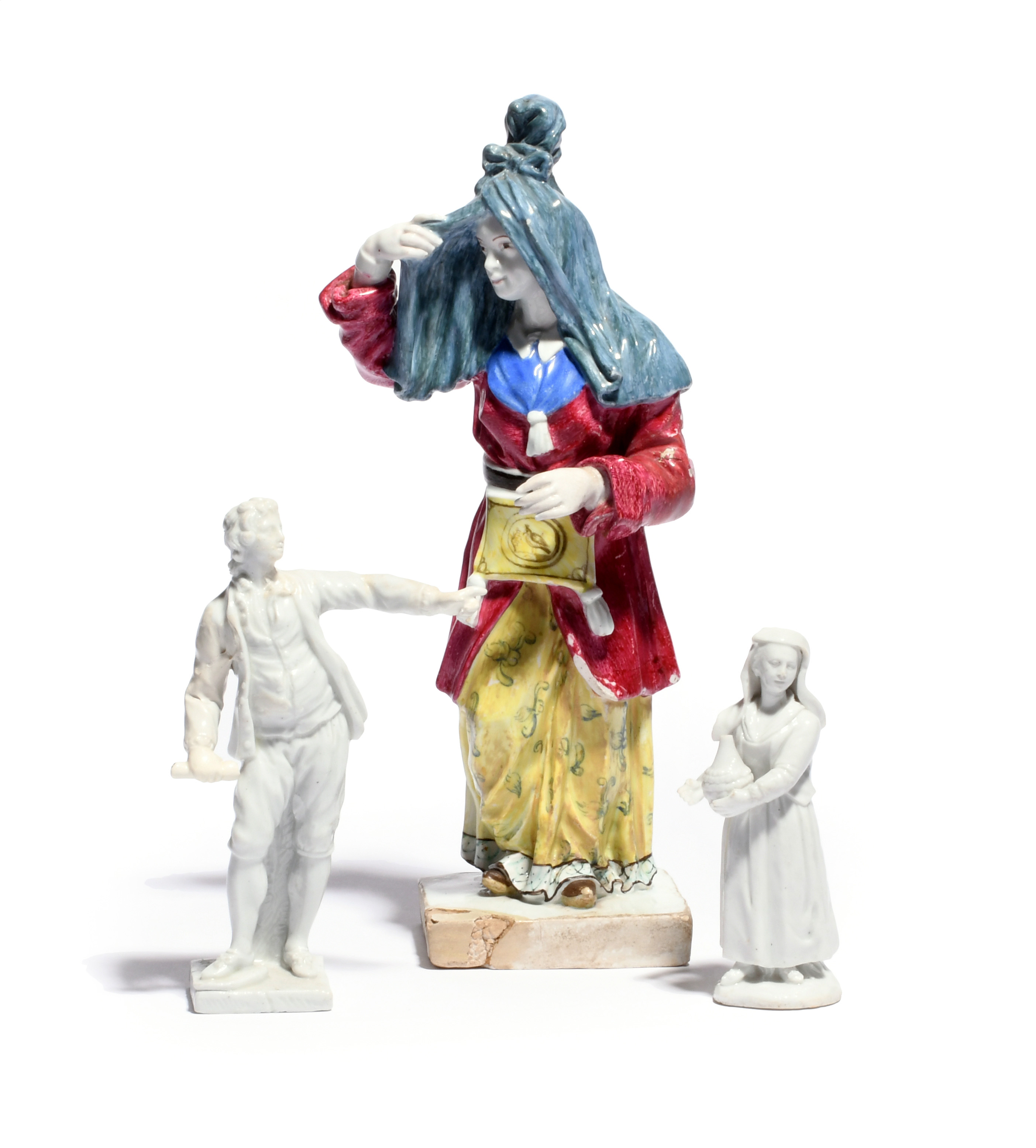 An unusual Buen Retiro figure of a Turkish or Levantine lady late 18th century, raising a blue veil away from her face, wearing a tasselled bag around her waist, blue fleur de lys mark, a Doccia white-glazed figure of a man holding a scroll and pointing to his left, and an Italian figure of a lady carrying a bottle of wine, damages and repairs, 25.3cm max. (3)