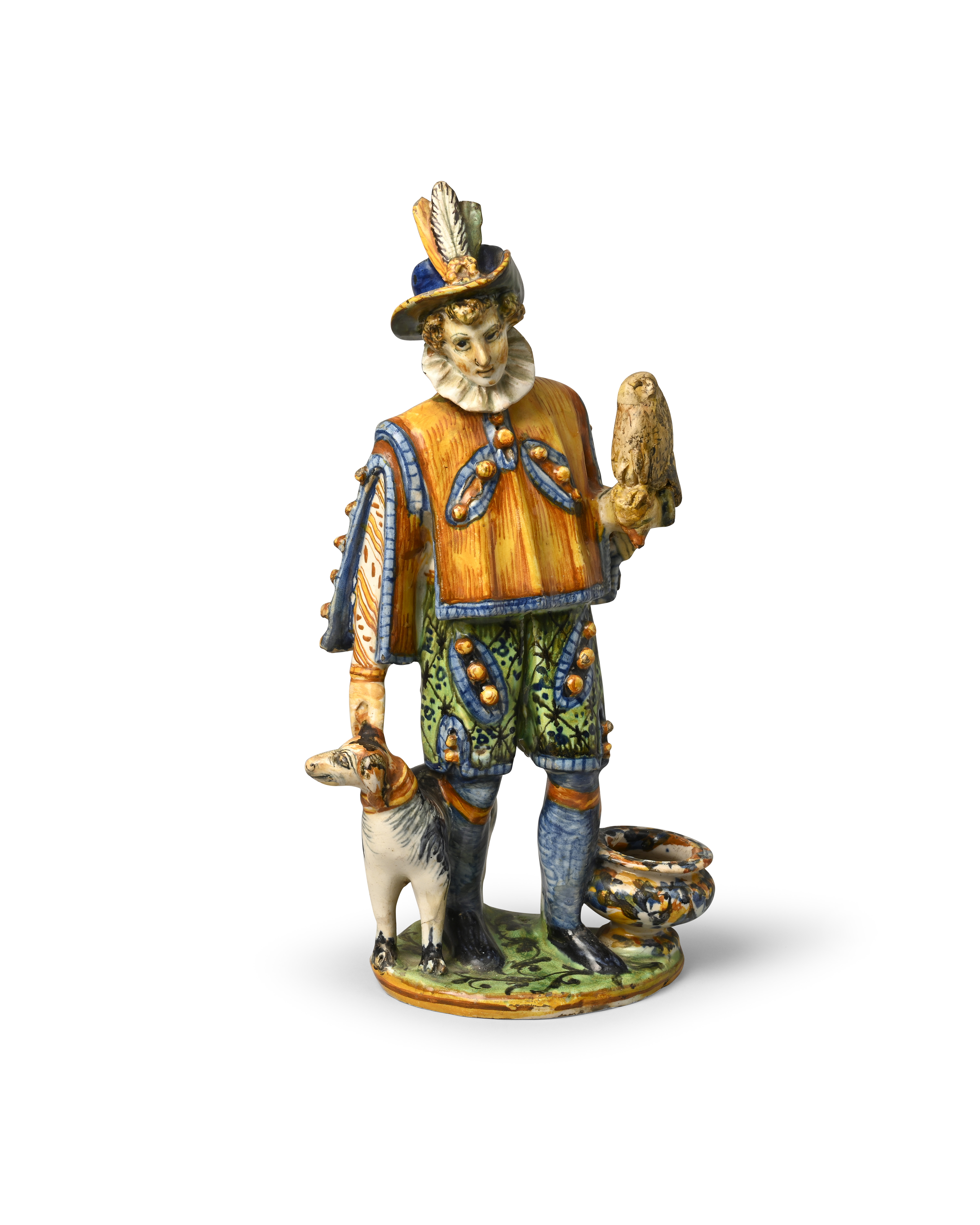 A rare maiolica figure of a huntsman Urbino c.1560-70, resting one hand on the back of his dog's neck, a bird of prey perched on his gloved left hand, standing beside a low vase and raised on a pad base decorated with foliate scrolls, some damages, 37.5cm.