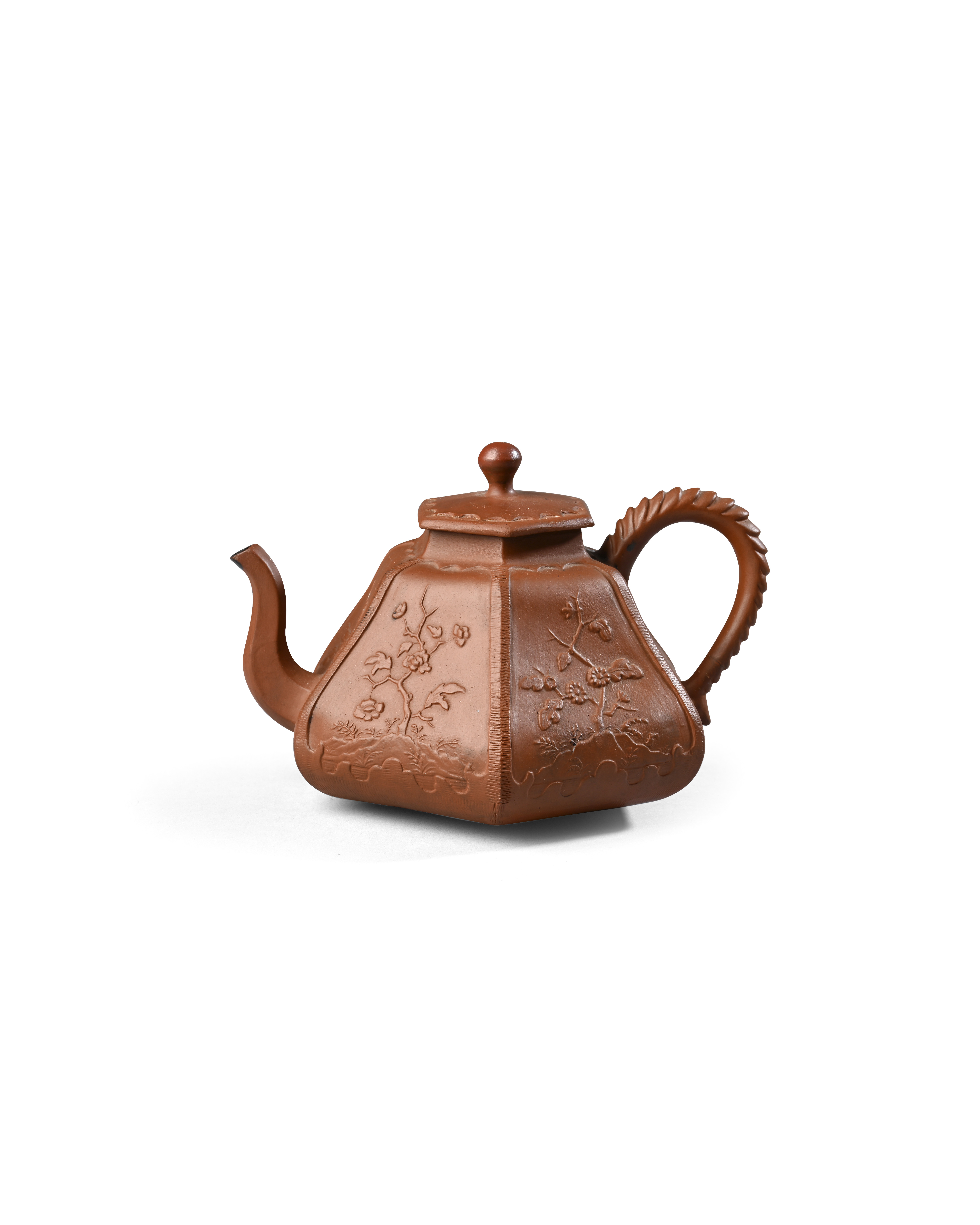 A rare Böttger stoneware hexagonal teapot and cover c.1710-15, the tapered hexagonal form moulded with a different flowering Oriental plant to each panel, glazed black to the interior, with ribbed handle and delicate faceted spout, 15cm across. (2)