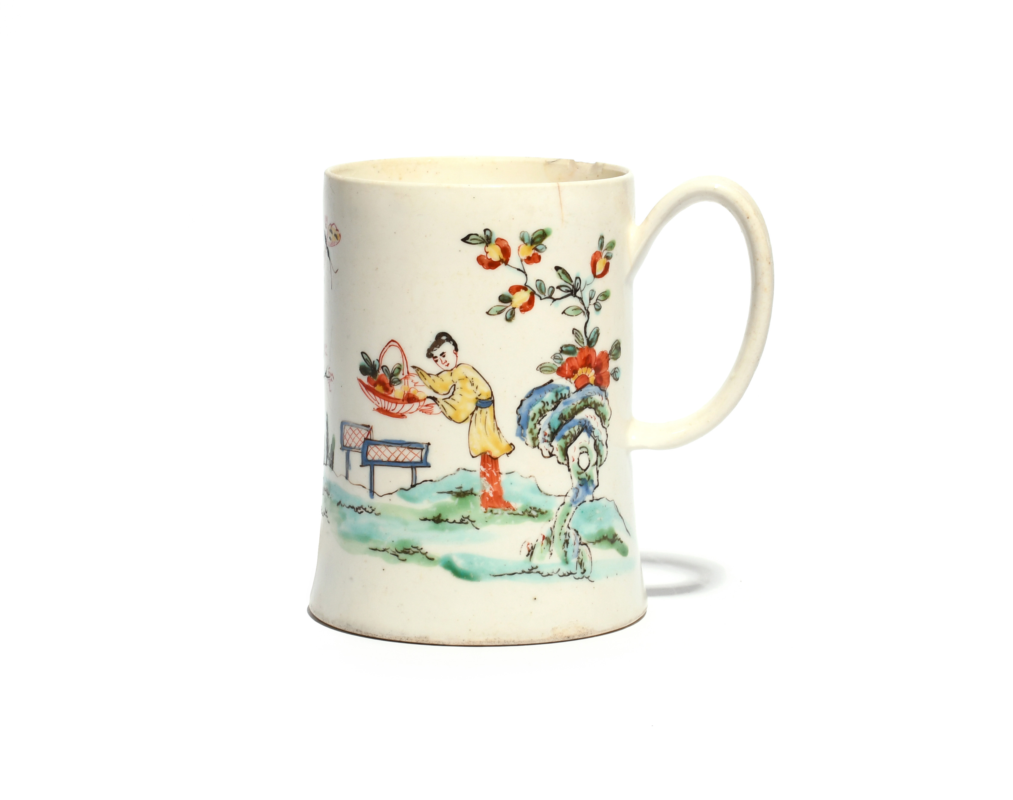 A large Bow mug c.1755, the slightly tapering cylindrical form with spreading foot, painted in bright polychrome enamels with a Chinese figure holding a basket of flowers, a moth in flight above, the reverse with flowering branches and reeds by the water's edge, red B mark, some rim faults, 12cm.