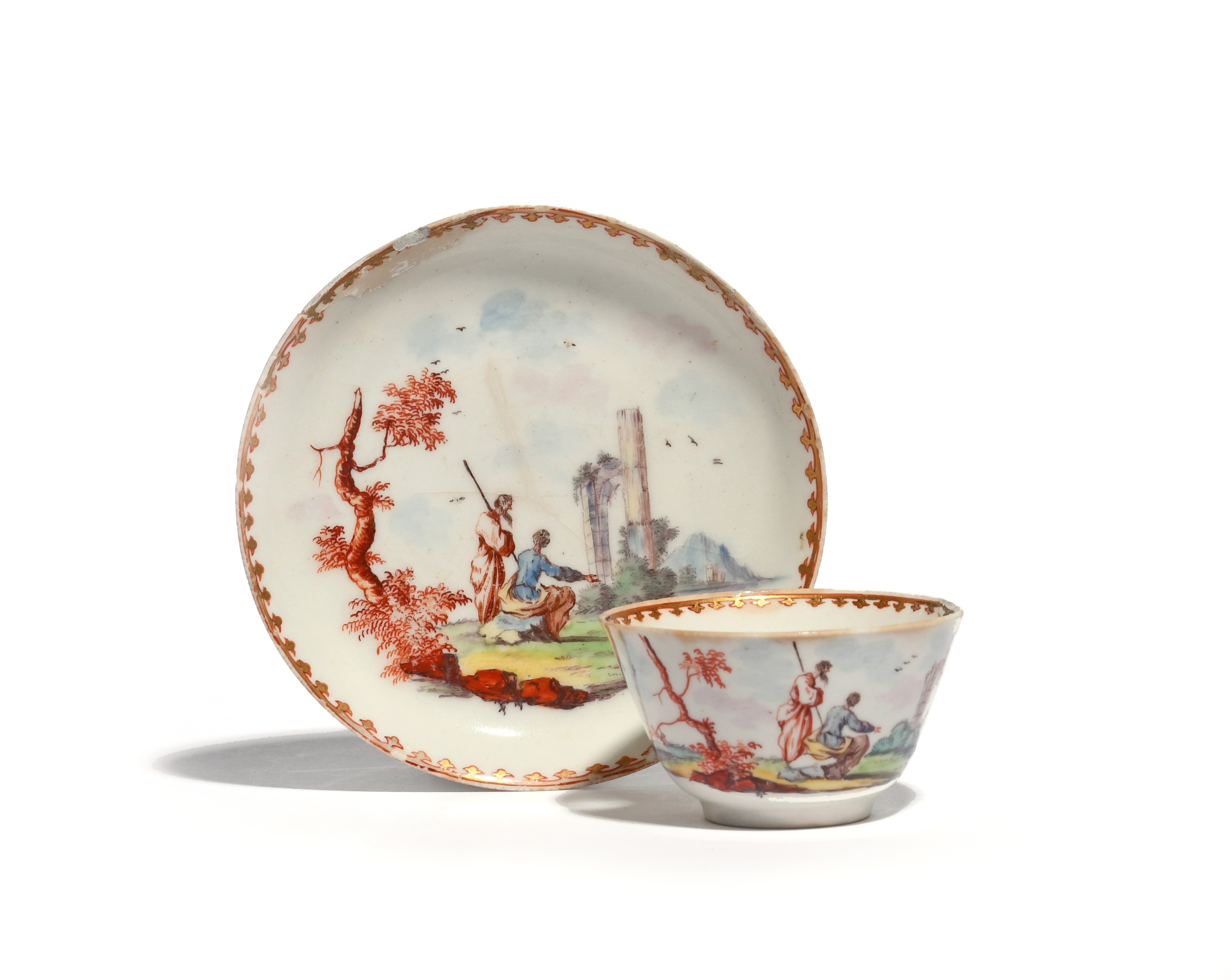 A Bow teabowl and saucer c.1757-62, painted by Jefferyes Hamett O'Neale probably at the atelier of James Giles, with Classical figures before tall ruins and a brown tree, within a gilt and red spearhead border, some rim repairs, 12.2cm. (2)