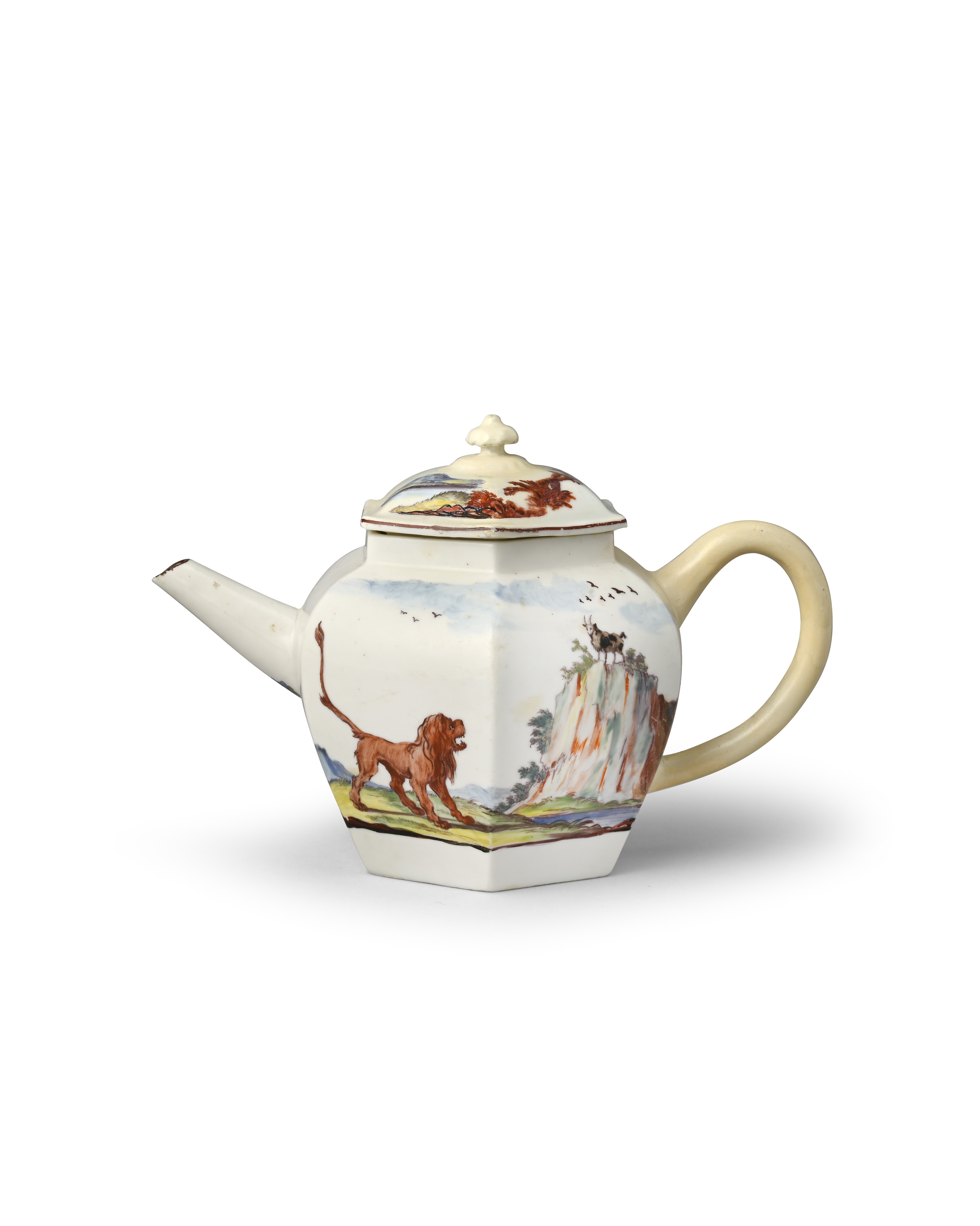 A Chelsea hexagonal Fable-decorated teapot and cover c.1752-55, painted by Jefferyes Hamett O'Neale with a depiction of the Lion and the Goat, the latter standing atop a mountain while vultures circle above, the lion the other side of a stream, looking up towards his former adversary, in a continuous landscape scene with brown trees, the cover with similar landscape decoration, the cover and handle with old restoration, 18cm across. (2)