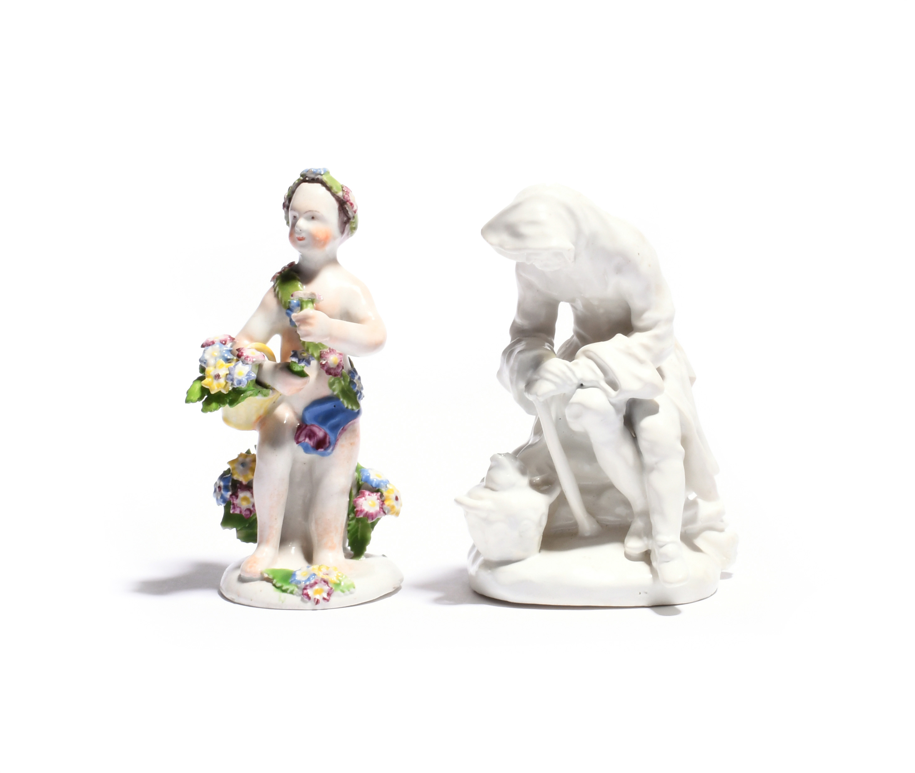 Two Bow figures c.1756-65, one a white-glazed figure of Winter wrapped in a hooded coat and leaning over a flaming brazier, the other of a putto possibly emblematic of Spring, standing with a basket of flowers and draped in further blooms, some damages and restoration, 13cm max. (2)