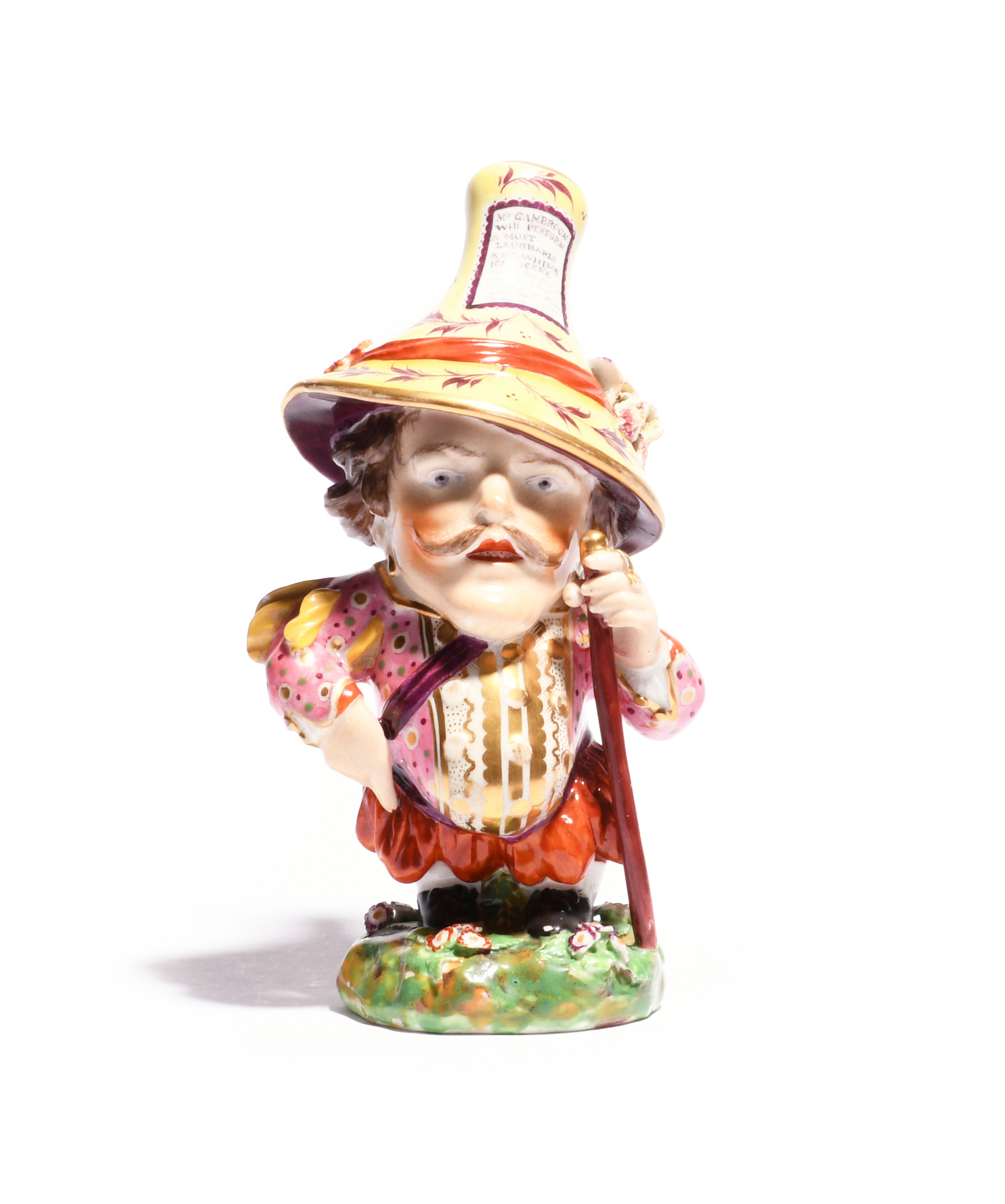 A Derby figure of a Mansion House Dwarf c.1810, wearing a comically large hat bearing a playbill for Mr Gambroon, wearing a patterned tunic and holding a staff, red crowned crossed batons and D mark, 17cm.