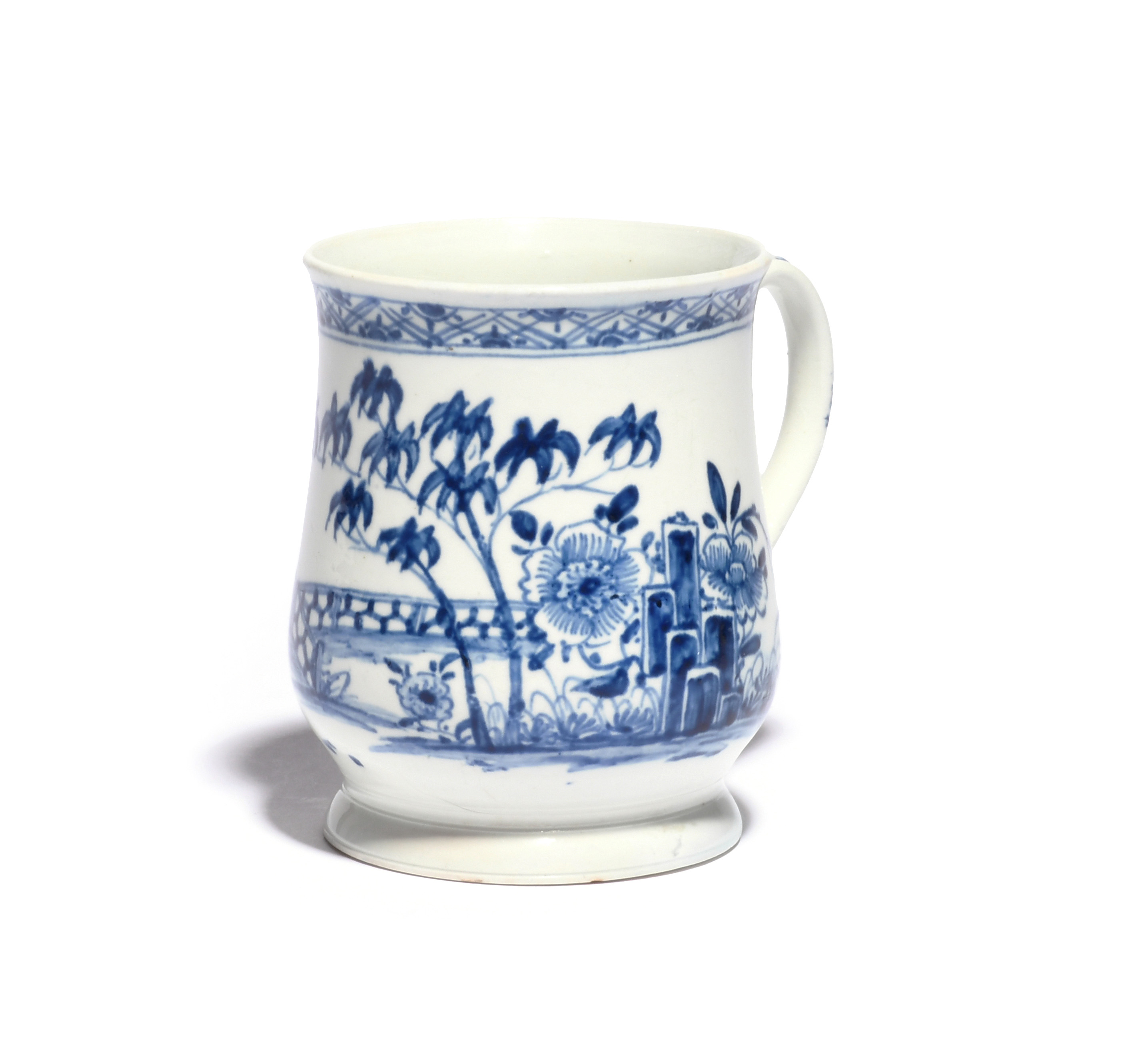 A Vauxhall blue and white mug c.1756-58, the squat baluster form painted with bamboo and flowering peony beside jagged rockwork and a low ornamental fence, with a trellis border to the rim, a foliate motif to the grooved strap handle, a small filled rim chip, 9cm.