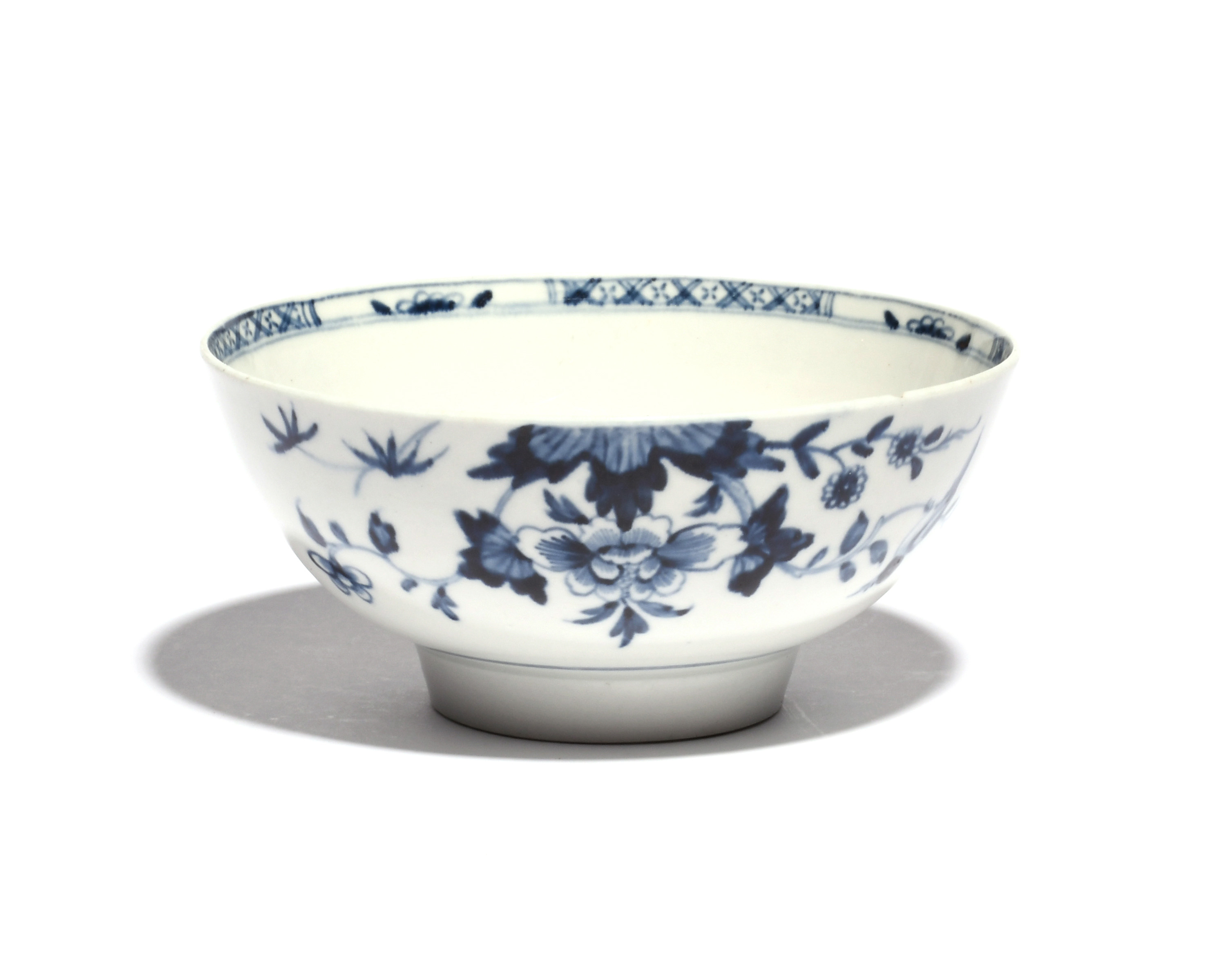 A William Reid (Liverpool) blue and white slop bowl c.1756-60, painted with the Bird on a Branch pattern, orientated towards the foot, a single bird perched on flowering peony branches, the interior rim with a panelled trellis border, numeral 8 inside the footrim, a small rim chip, 15.6cm dia.
