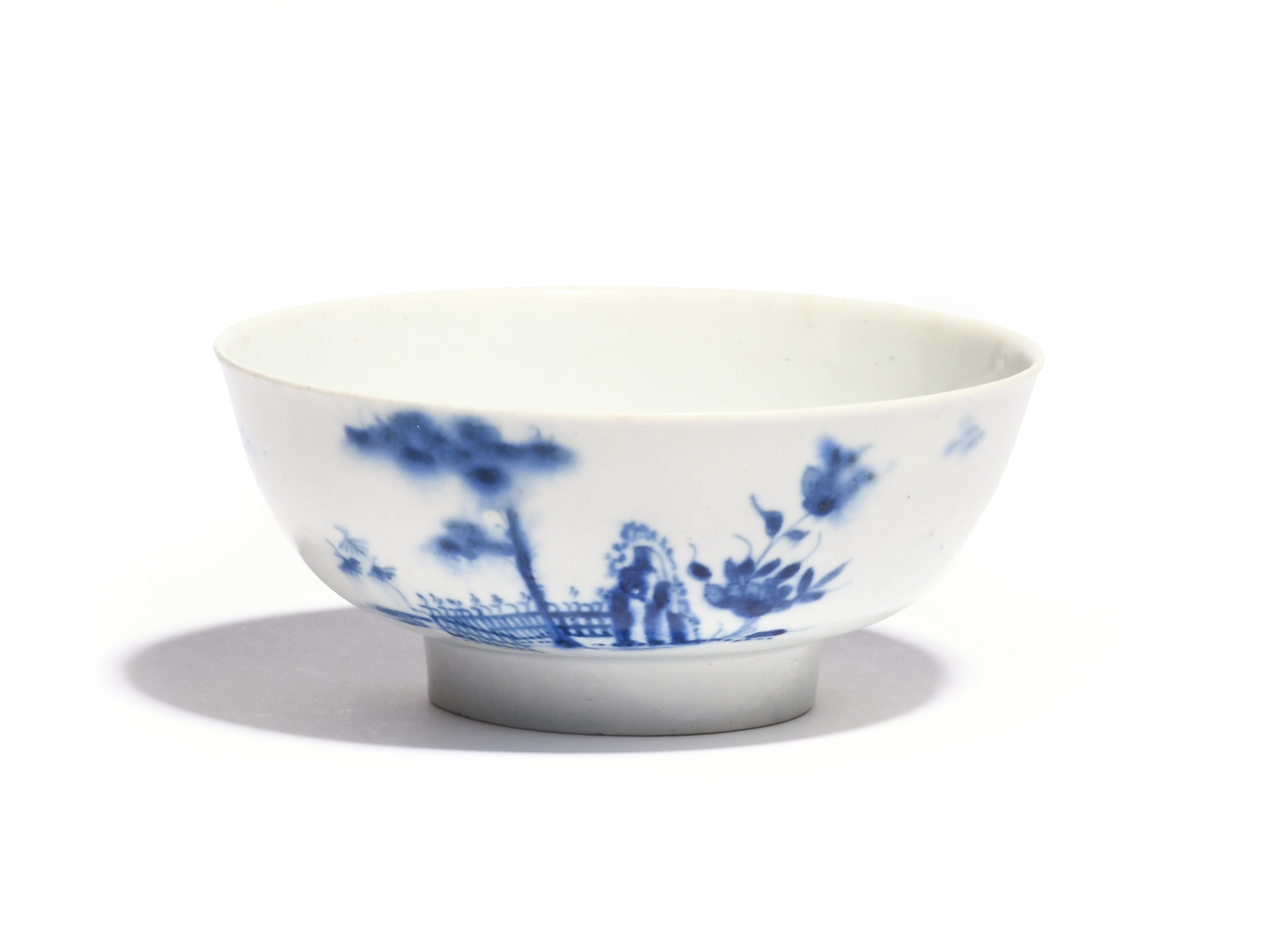 A Worcester blue and white slop bowl c.1754-56, painted with the Plantation pattern, with bamboo and flowering branches by a low fence, the reverse with a low hut on a rocky island, workman's mark, a few small filled rim chips, 13cm dia.