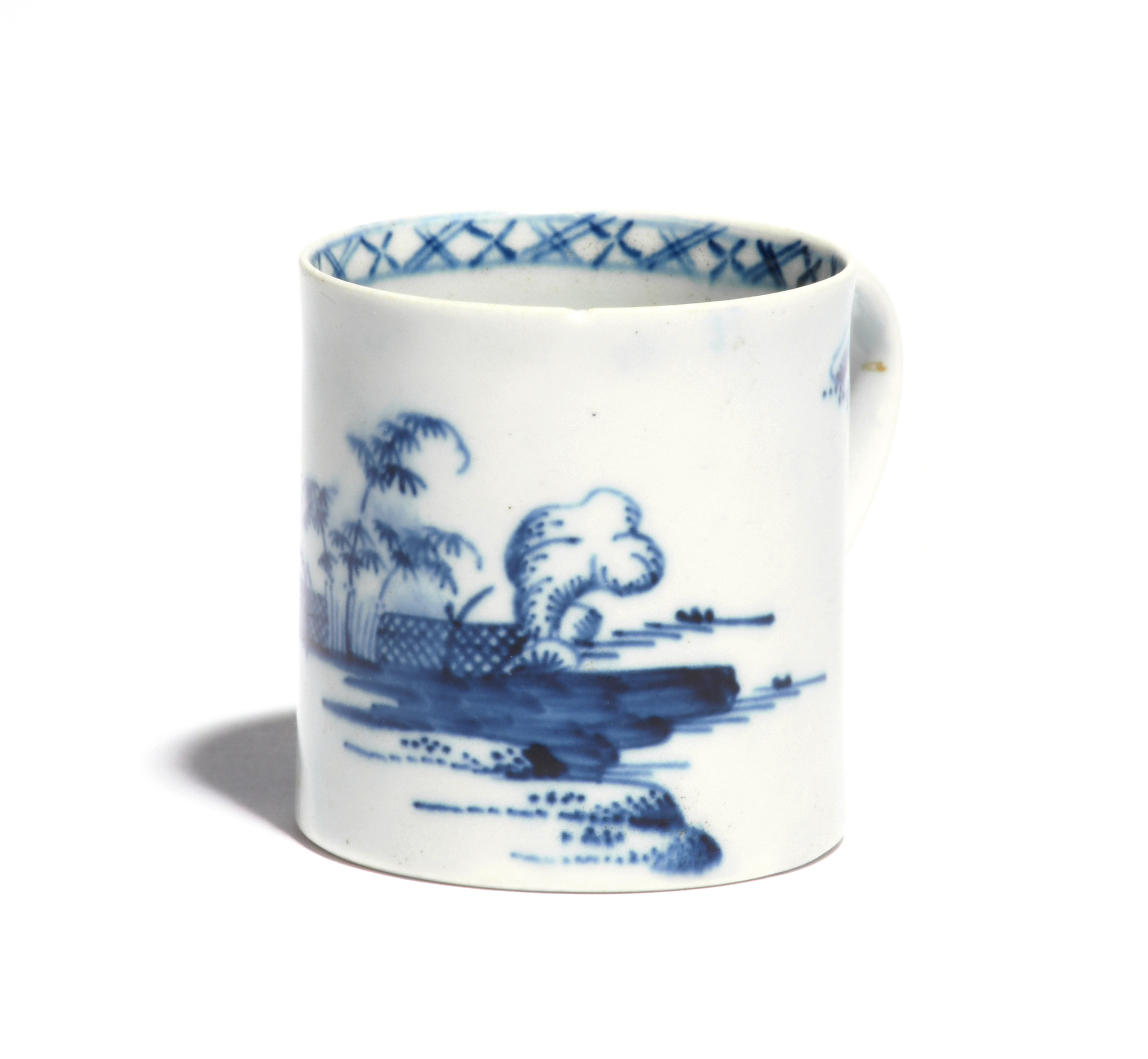 A Richard Chaffers (Liverpool) small blue and white mug or coffee can c.1758-60, painted with bamboo and 'Triffid' type rockwork beside a low trellis fence, 6.5cm.