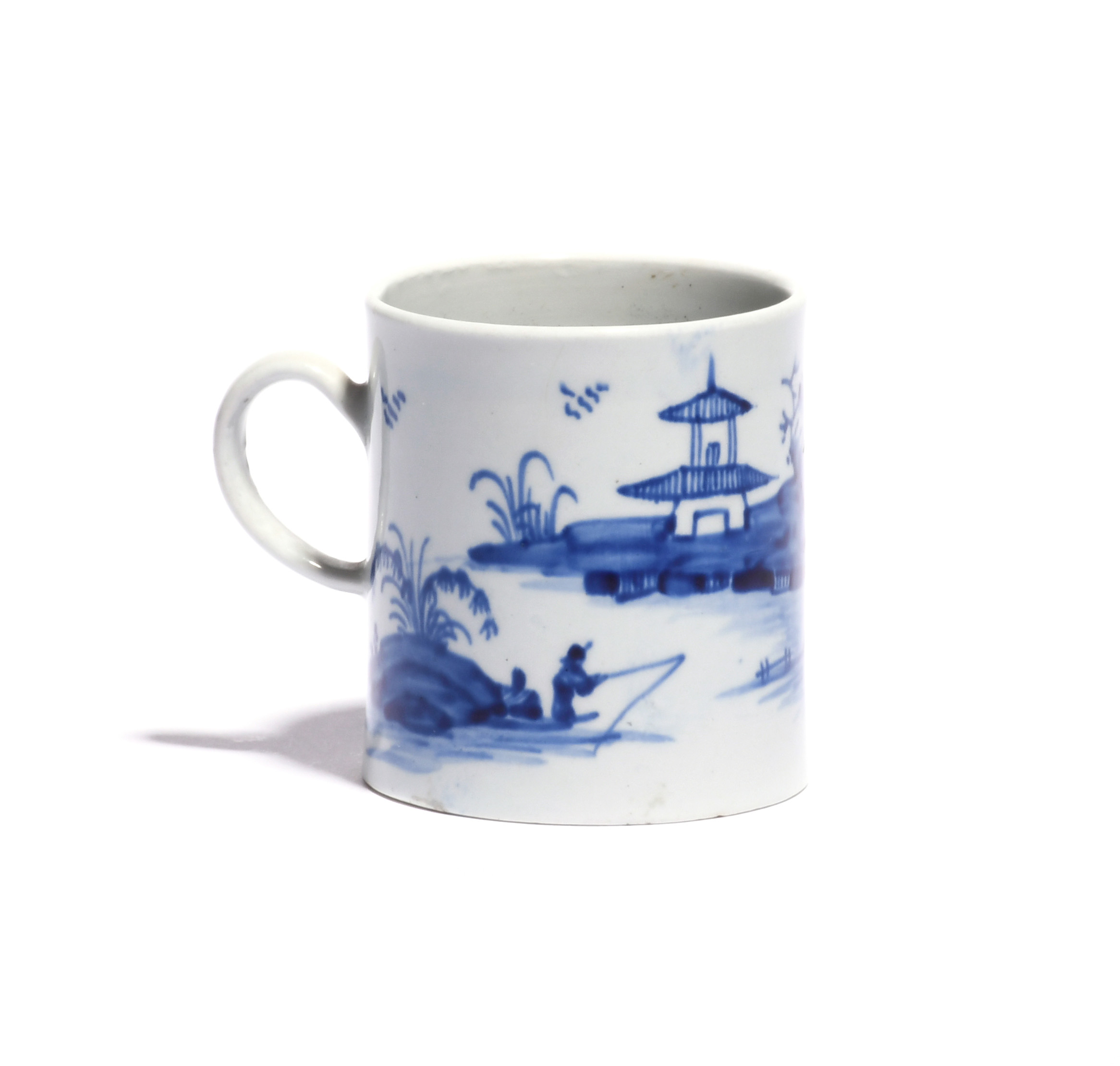 A Vauxhall blue and white small mug or can c.1755-58, the cylindrical form with a slightly flared foot, painted in a bright blue with a figure fishing in a continuous pagoda island landscape, 6.7cm.
