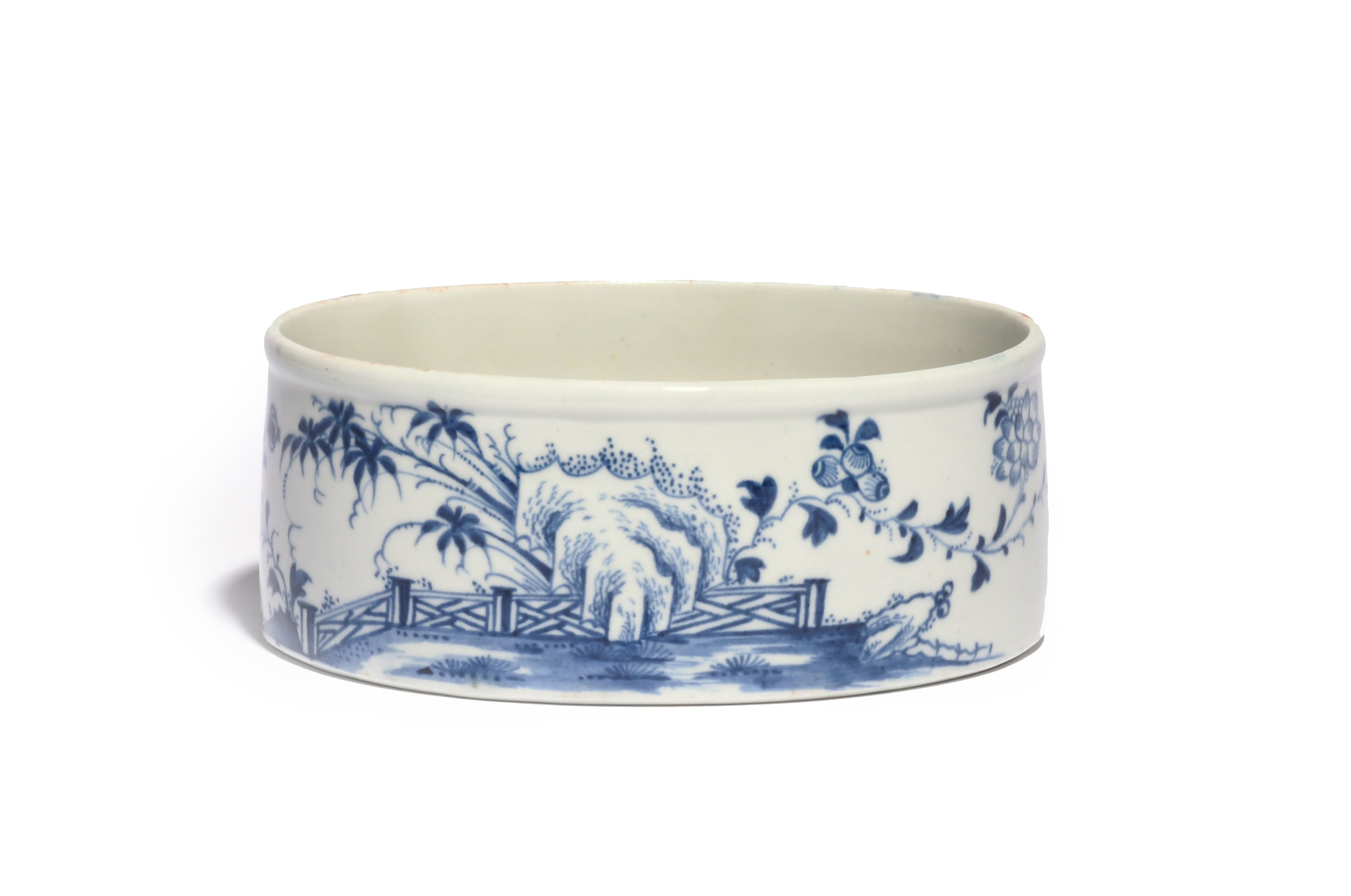 A Philip Christian (Liverpool) blue and white potted meat dish c.1765-70, the straight-sided oval form painted with bamboo and flowering branches issuing from layered rock before an ornamental fence, the reverse with a flower spray, 14.5cm across.