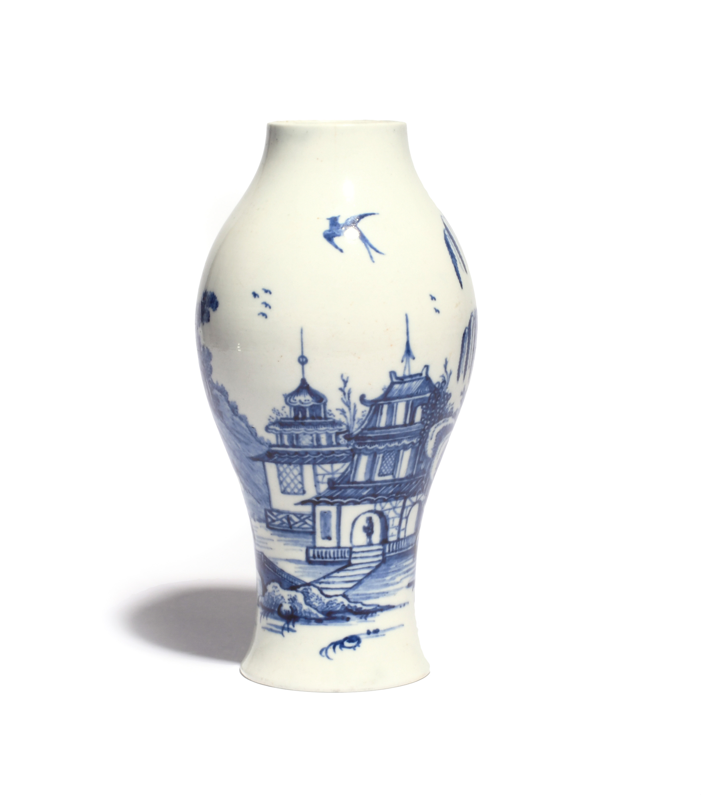 A tall blue and white Liverpool vase c.1765, James Pennington or Richard Chaffers, the baluster body finely painted with a figure standing in the doorway of a tall pagoda, a further figure on a bridge spanning a river beside jagged rocks, two further figures on the other bank beneath wisteria, with birds in flight above, incised 6 to the base, the cover lacking, a few faint rim cracks, 22.5cm.