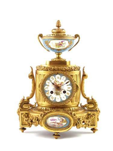 A late 19th century French gilt brass and porcelain mounted mantel clock