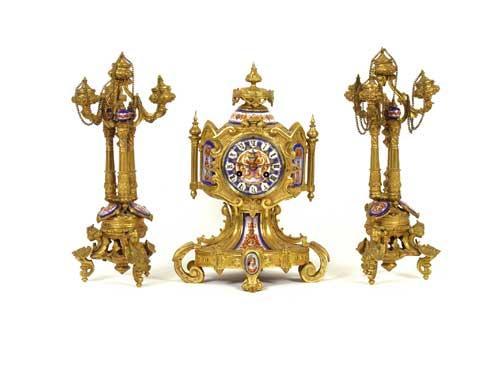 A late 19th century gilt brass and porcelain mounted clock garniture