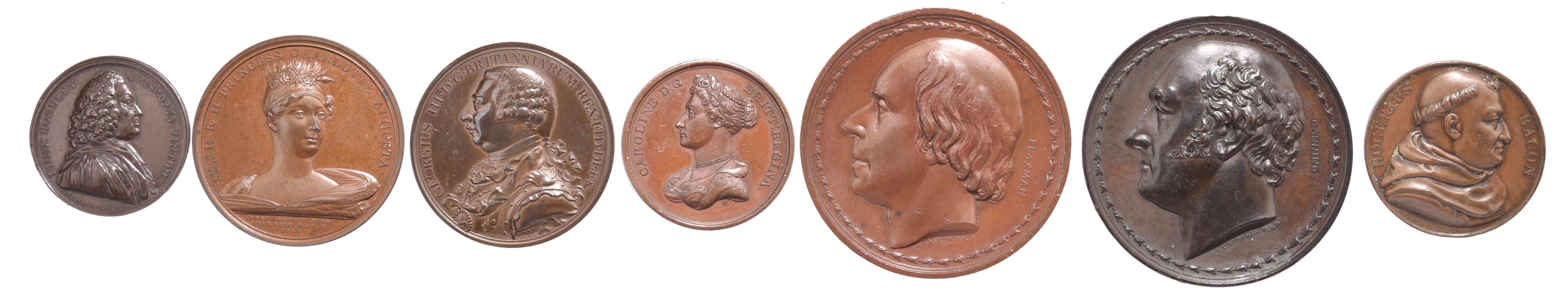Seven various historical medals: Death of Benjamin Hoadley 1761, AE, 37mm, bust right, rev. mitre and crosier on a plinth below a tree, by J. Kirk (E 697), good very fine; Death of Princess Charlotte 1817, AE, 49mm, bust with crown of roses, rev. Britannia in mourning beside an urn, by T. Webb (E 1097), nearly extremely fine; Death of George III 1820, AE, 48mm, armoured bust left, rev. legend within a wreath, by C.H. Küchler (E 1121), good very fine; Return of Caroline to England 1820, AE, 40mm, laureate bust left, rev. Britannia welcomes an approaching ship, by P. Kempson (E 1130), nearly extremely fine; Death of John Flaxman 1826, AE, 62mm, head left, rev. classical female figure leaning on a column with a ribbon inscribed 'TO GREAT MEN' (E 1185), good very fine or better; Death of George Canning, another from the same series as the last, good very fine; together with: Roger Bacon Memorial 1294, AE, 41mm, bust right, rev. inscription, by R.Gayrard Paris 1818 (E 9), about very fine. [7]
