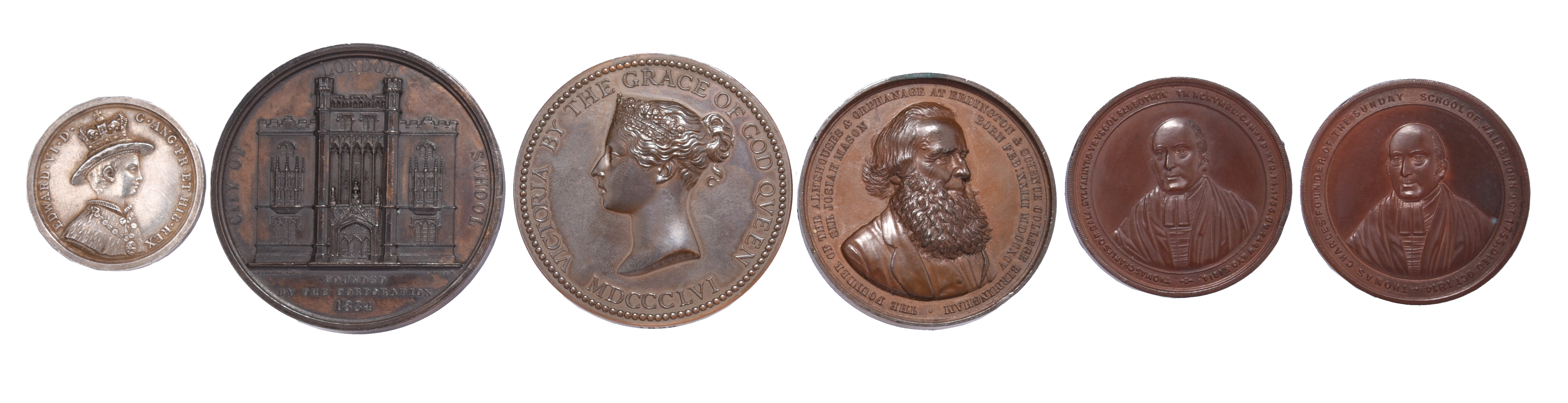 Six British Educational medals: Christ's Hospital Marker's Prize, AR, 35mm, crowned bust of Edward VI right, rev. an open bible, 'HEAR READ MARK LEARN', edge incribed (WILLIAM ORMES 1802), by L. Pingo (E 29), good very fine or better; City of London School 1834, AE, 58mm, facade of the school, rev. Knowledge instructs a youth (E 1279), extremely fine; Department of Science and Arts Queen's Medal 1856, AE, 55mm, Victoria's head left, rev. six lines of text commencing 'NATIONAL MEDAL' (variant of E 1511), nearly extremely fine; Mason Science College 1880, AE, 51mm, bust of Sir Josiah Mason right, rev. facade of the college (E 1670), minor knocks and verdigris, otherwise extremely fine; Sunday School Centenary Wales 1885 (2), AE, 44mm, one each of the Welsh and English versions (E 1713), minor dents, extremely fine. [6]