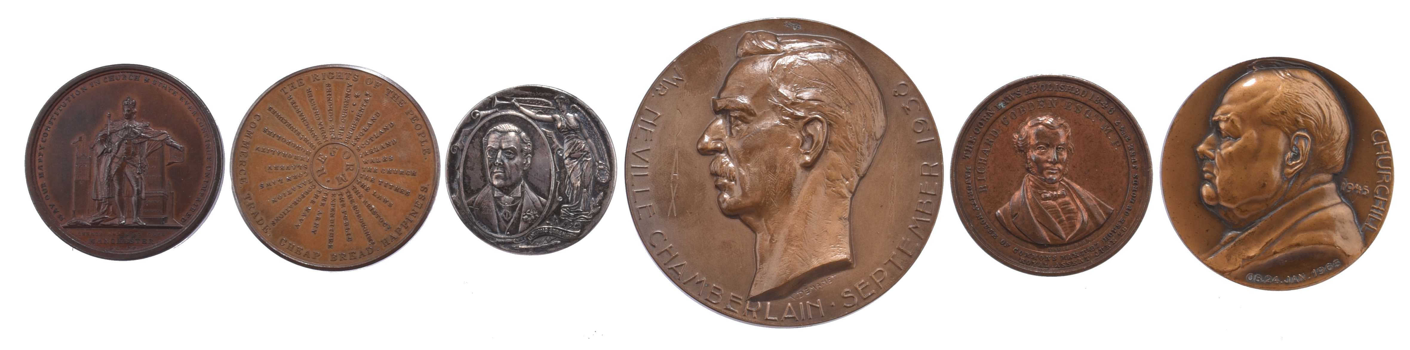 A quantity of commemorative medals, political themes, including: Church and King Club Manchester 1790, AE, 44mm, by L. Pingo, good very fine; the Reform Movement 1831, AE, 46mm, 'REFORM' to a small central circle, radiating text describing the foci of the movement, rev. a list of patrons and 'SALUS POPULI SUPREMA LEX', extremely fine or nearly so; Joseph Chamberlain 70th Birthday, silver plated, 38mm, good very fine; Munich Agreement 1938, AE, uniface, 70mm, bust of Neville Chamberlain left, by V. Demanet, extremely fine; and two others. [6]