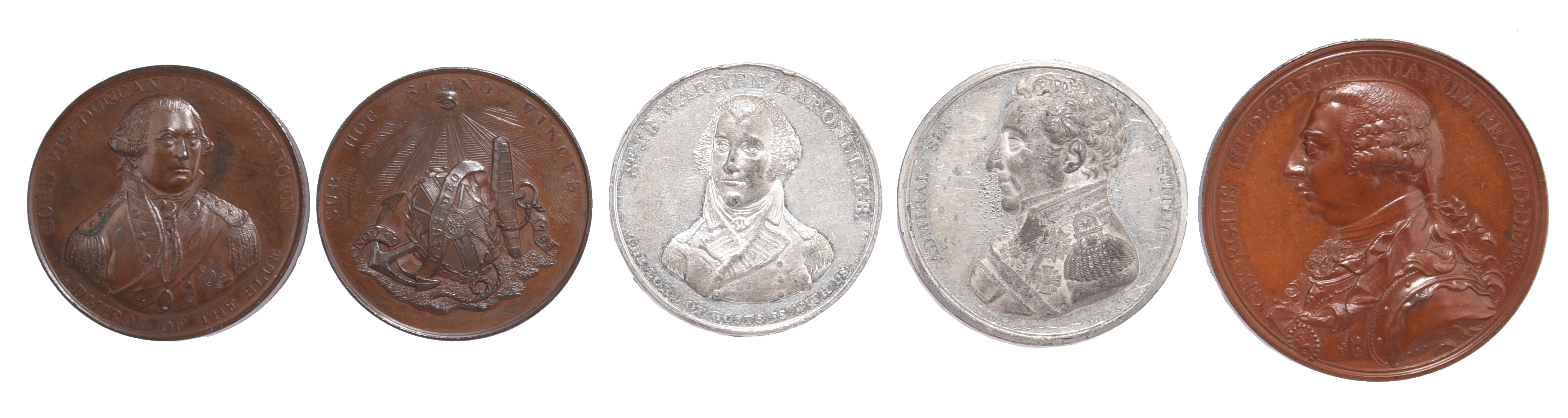 Five British historical medals commemorating naval and military victories: Battle of Camperdown 1797, AE, 38mm, bust of Admiral Duncan, rev. Britannia seated with laurels and a lion (E 887), nearly extremely fine; Battle of the Nile/ Entry of Ferdinand IV into Rome 1798, AE, 38mm, Victory seated with a lion in front of a Pyramid holding a medallion of Nelson, rev. shield and fouled anchor (E 892, Hardy 8), good very fine; Naval Action off Tory Island 1798, WM, 38mm, bust of Admiral Warren, rev. a naval engagement, 'THE SISTER COUNTRY AGAIN RESCUED FROM INVASION' (E 896), near very fine; British Victories 1798, AE, 48mm, bust of George III left, rev. Britannia surrounded by martial trophies holding Victory, by C.H. Küchler (E 897), good very fine or better; Siege of Acre 1799, WM, 41mm, bust of Admiral Sir Sidney Smith left, rev. a lion defends a camel from a tiger, by G. Mills/ N.G.A. Brenet (E 906), near very fine; all by T. Wyon Sr. unless otherwise stated. [5]