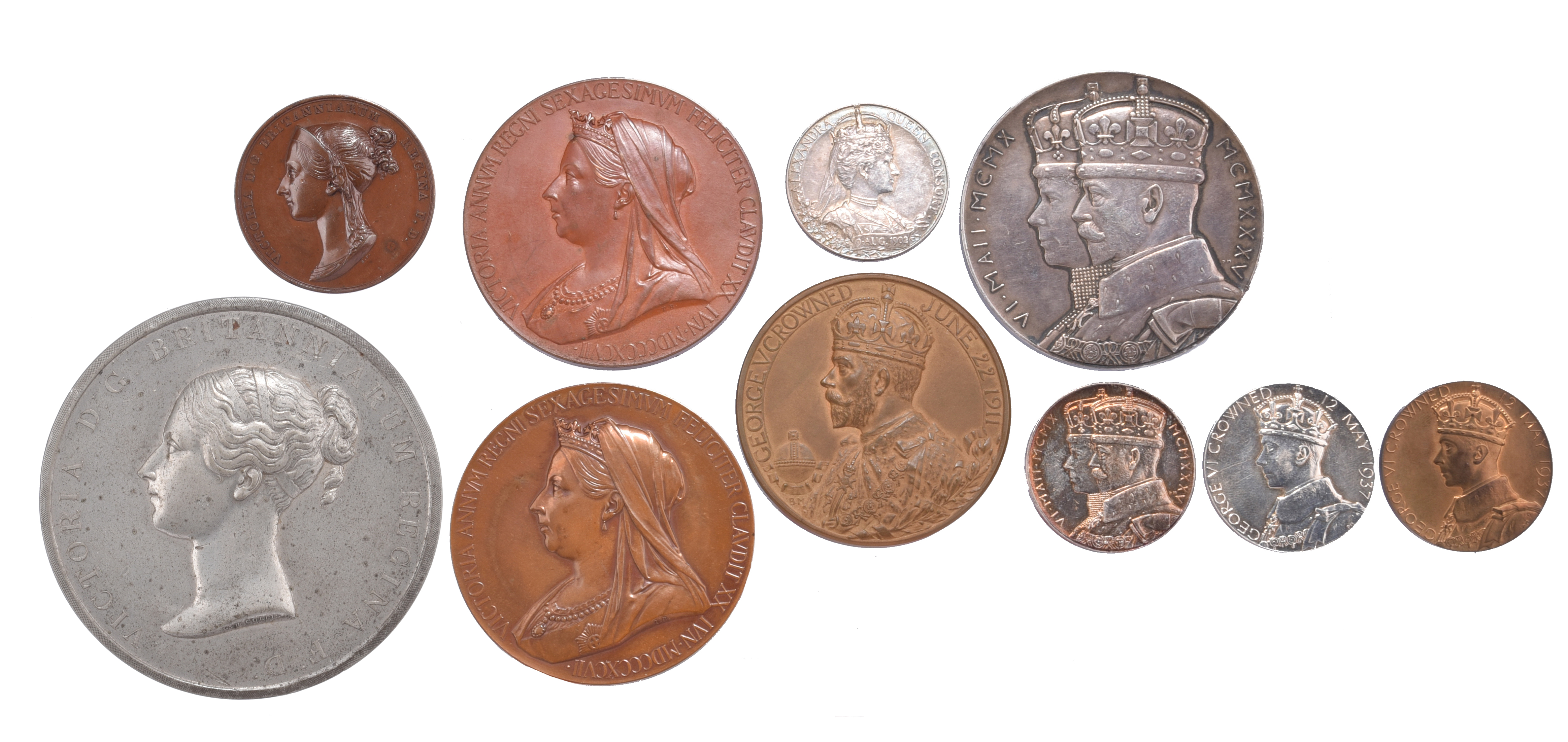 A collection of British Coronation and Jubilee medals, comprising: Coronation of Victoria 1838, WM, 73mm, head left, rev. Victoria crowned on a sea rock with attendants, by G.R. Collis (E 1310), shallow pitting to obverse, otherwise better than very fine; Coronation 1838, AE, 36mm, bust left wearing a bandeau, rev. Britannia, Scotia and Hibernia present the crown to Victoria, by B. Pistrucci (E 1315), small dent to cheek and other minor marks, otherwise extremely fine; Diamond Jubilee 1897 (2), AE, 56mm, draped bust left, rev. young head (E 1817a), one extremely fine the other nearly so; Coronation of Edward VII 1902, AR, 31mm (E 1871b), good very fine; Coronation of George V 1911, AE, 51mm (E 1922a), nearly extremely fine; Silver Jubilee 1935 (2), AR, 57 and 32mm (E 2029a and 2029b), good very fine and nearly extremely fine; Coronation 1937 (2), AR and AE, 30mm (E 2046b), good very fine or better. [9]