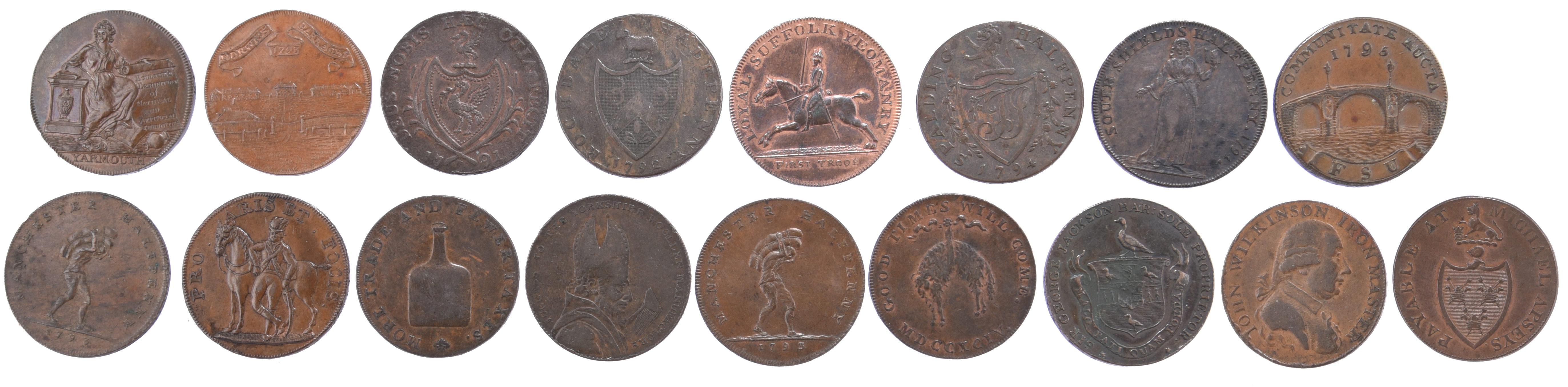 Eighteenth century halfpenny tokens, Northern and Eastern England, including: Norfolk: Yarmouth, seated woman with scroll (straight exergue), rev. Britannia receiving gifts 1796, edge JOS DANL & JNO BOULTER (Withers p. 313), extremely fine or nearly so; Norwich, Mounted Dragoon, rev. view of barracks, good very fine; Suffolk: Blything, mounted yeoman (sword to L), rev. castle in garter, edge KING AND CONSTITUTION, very fine; Hoxne, soldier with horse, rev. castle in garter, edge KING AND CONSTITUTION, good very fine; Lancashire: Manchester, man with sack 1793, rev. arms, edge engrailed, very fine; and fourteen others, grades from fine to near very fine. [17]