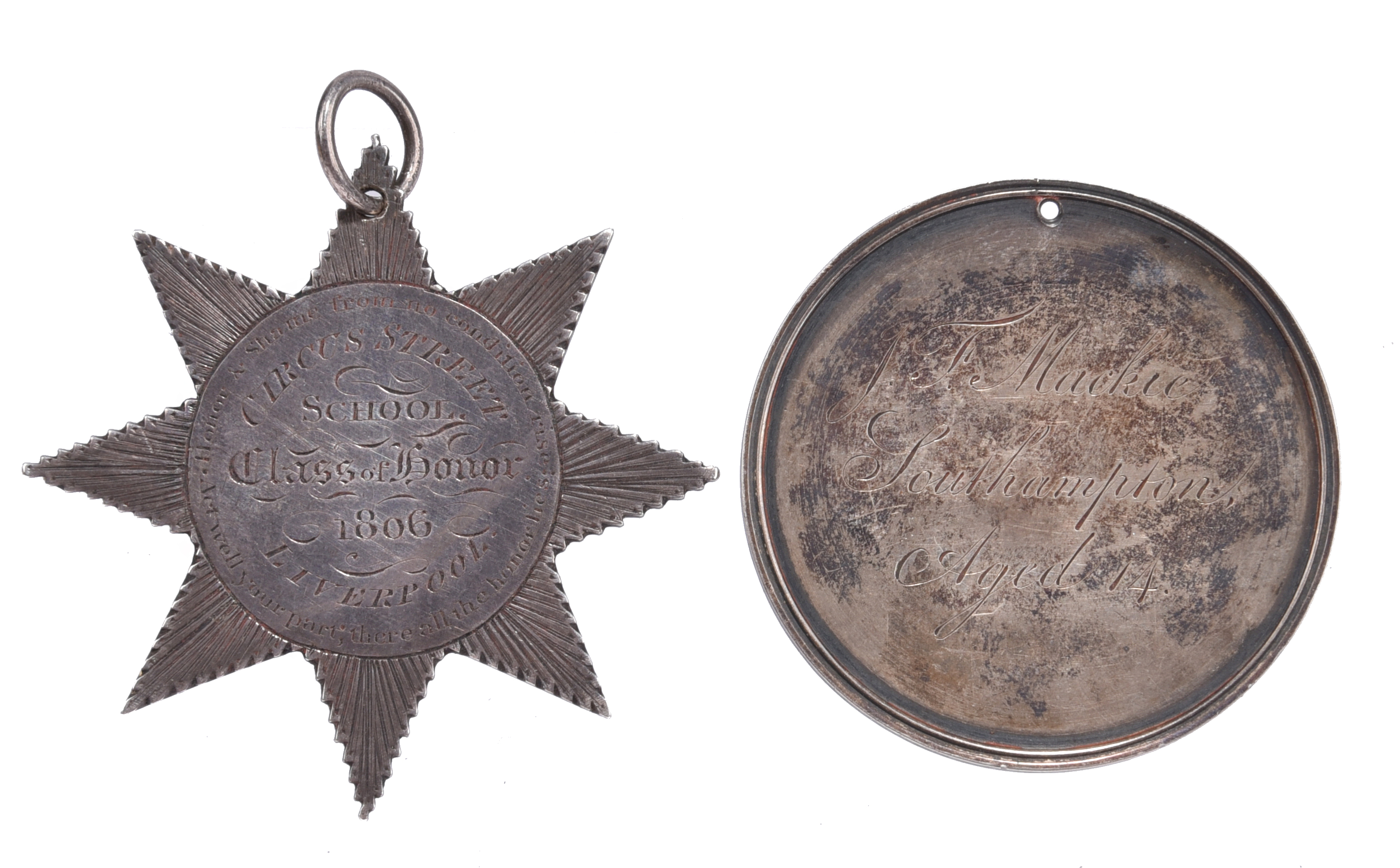 Education: two English engraved silver medals: Circus Street School Liverpool Class of Honour 1806