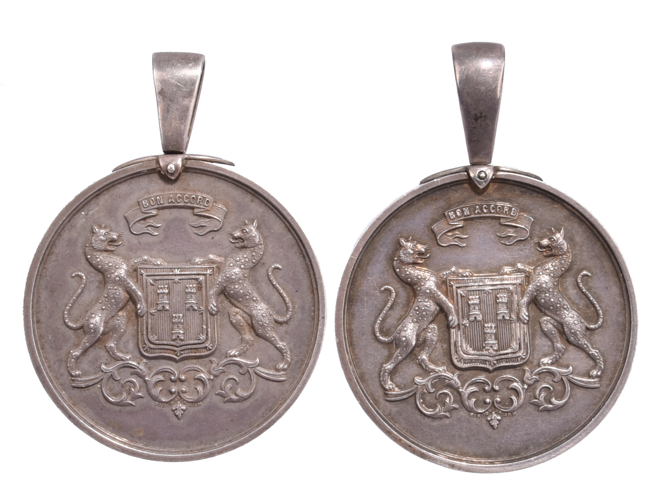 Scotland: Aberdeen: a pair of silver prize medals, struck and with engraved award details, 39mm, city arms, rev. engraved details within a wreath (Jacobo Moir Optime Merito...), 1888 and 1890, swivelling loop suspensions, 31g each, slightly loose suspensions, otherwise extremely fine. [2]