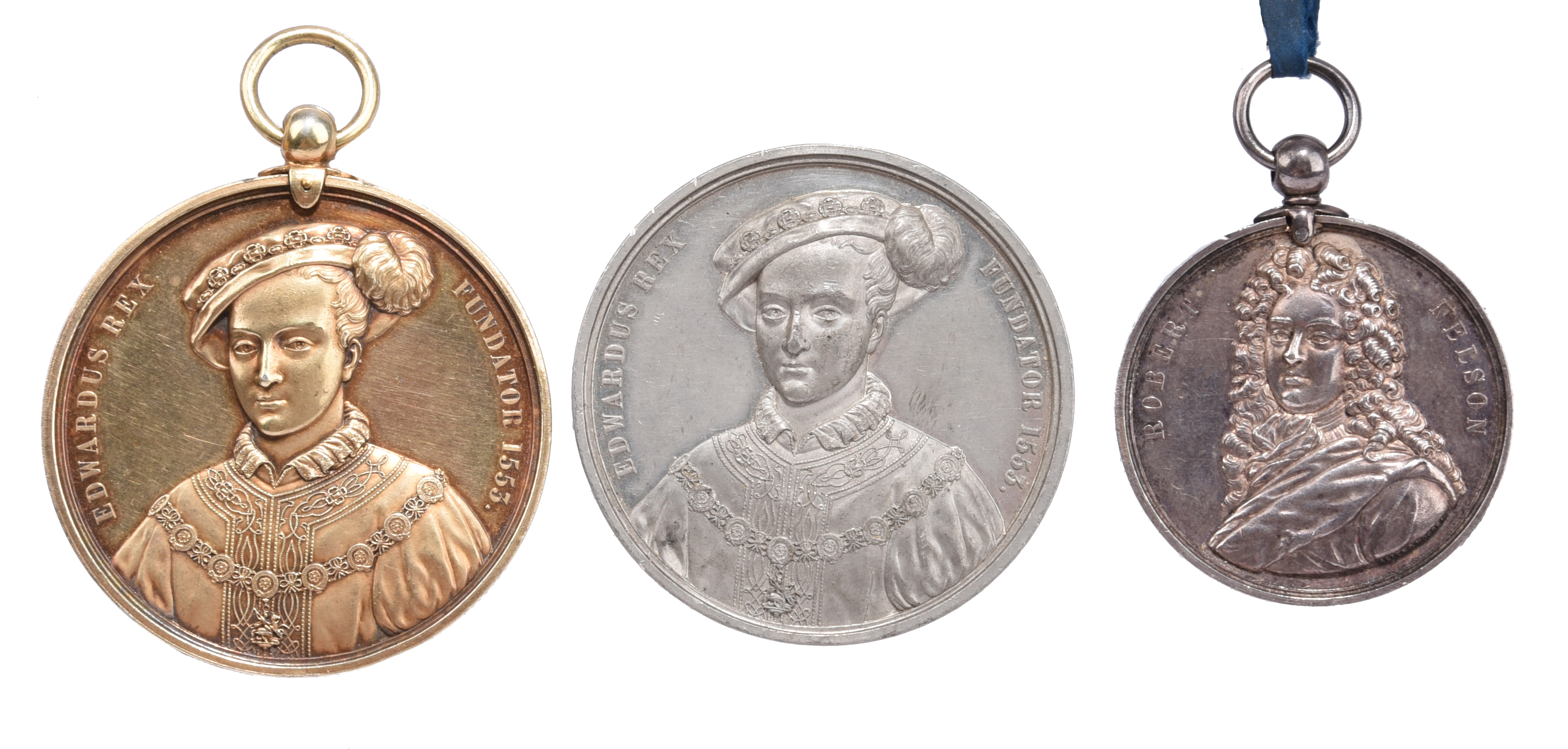 Bath Bluecoat School: three struck prize medals: gilt metal, 57mm, bust of Edward VI almost facing, rev. schoolmaster with pupils, 'THE BRODERICK MEDAL', edge engraved (CHARLES DAVID RUSSELL 1860), extremely fine or nearly so; another of this type, white metal, unnamed, light surface marks, nearly extremely fine; silver, 44mm, bust of Robert Nelson, rev. legend and assay marks, edge engraved (ARTHUR S. FLOWER 27TH DECR. 1881), Birmingham 1881, good very fine. [3]