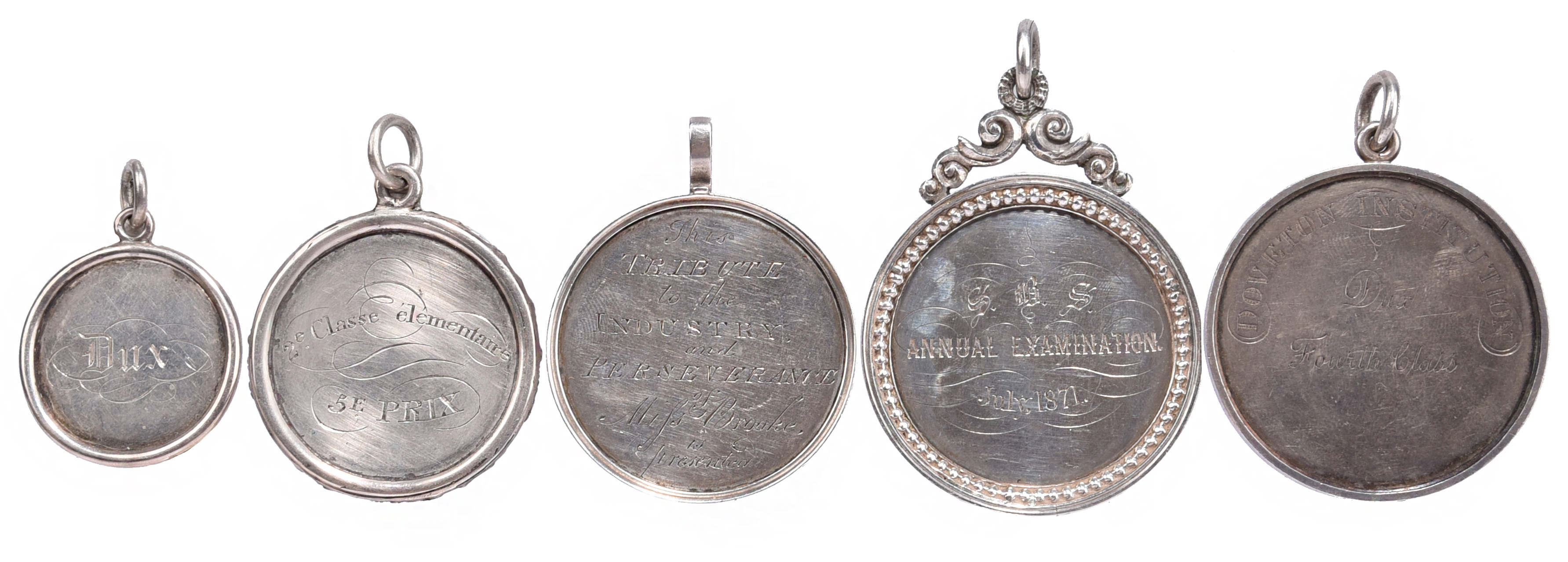 Ladies' schools: five prize medals: two to Georgina Anderson, AR, 29mm and 38mm, engraved, the first in a plain frame (DUX/ July 31st 1837), the second in a foliate frame (5E PRIX/ 27 Juillet 1839 F. ESPINASSE), 6.7g and 10.9g, good very fine; William Stevenson 18**, AR, 40mm, engraved (…TRIBUTE to the INDUSTRY and PERSEVERANCE of Miss Brooke), 11.6g, nearly extremely fine; S.B.S. Annual Examination July 1871, AR, 44mm, engraved and set in a beaded frame to an ornate scrolling suspension (Jane Heard Dux, of the School), 27.81g, nearly extremely fine; Doveton Institution 1884, AR, 44mm, engraved (Millicent Kirschner/ Dux Fourth Class), 26.99g, nearly extremely fine. [5]