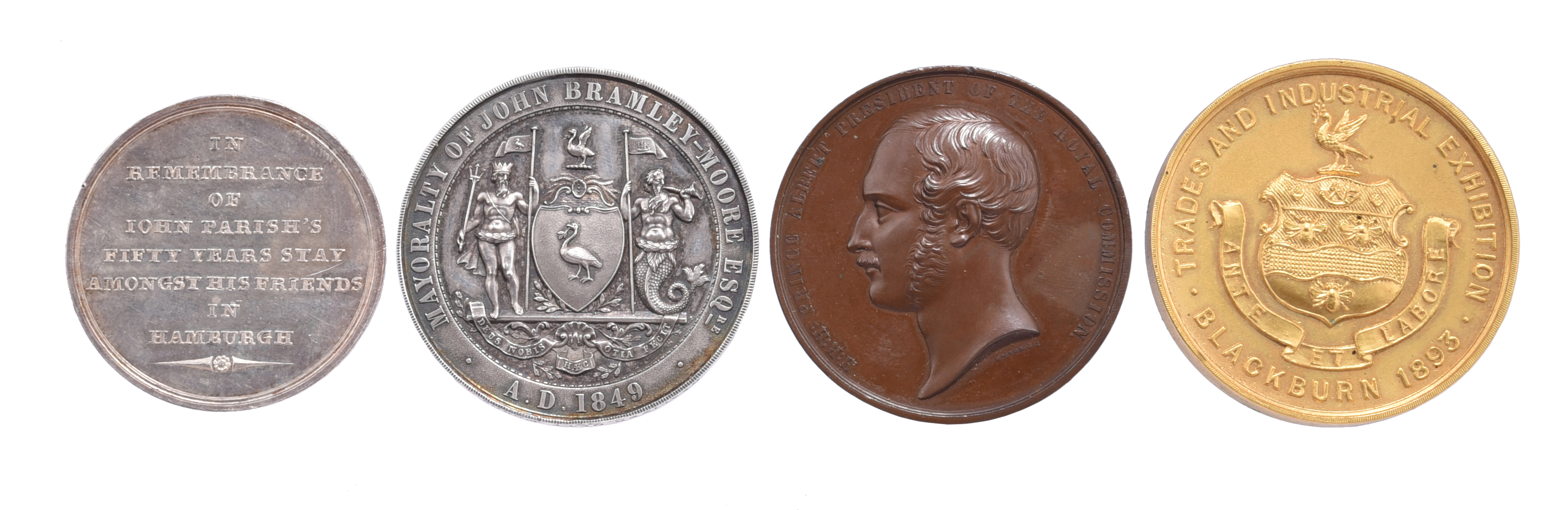 ', rev. dedication, a few scratches but nearly extremely fine with some lustre; Liverpool Infirmary 1849, Mayor John Bramley-Moore, Fancy Fair, a benefit event award medal, silver, 45mm, arms, rev. legend, edge engraved (Anne Fry. REALIZED NETT £9593.6.2), nearly extremely fine; Great Exhibition 1851, exhibitor's medal, AE, 44mm, head of Prince Albert left, rev. globe in a wreath, edge impressed (BRITISH GUIANA. NO 159), cased, extremely fine; Trades and Industries Exhibition, Blackburn 1893, a gilt bronze award medal, 45mm, arms and crest, rev, Victory bestowing wreaths on artisans, central shield impressed (PARKER BROS. DRIGHLINGTON), cased, extremely fine. [4]